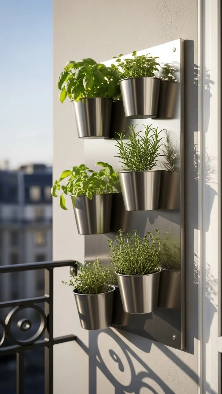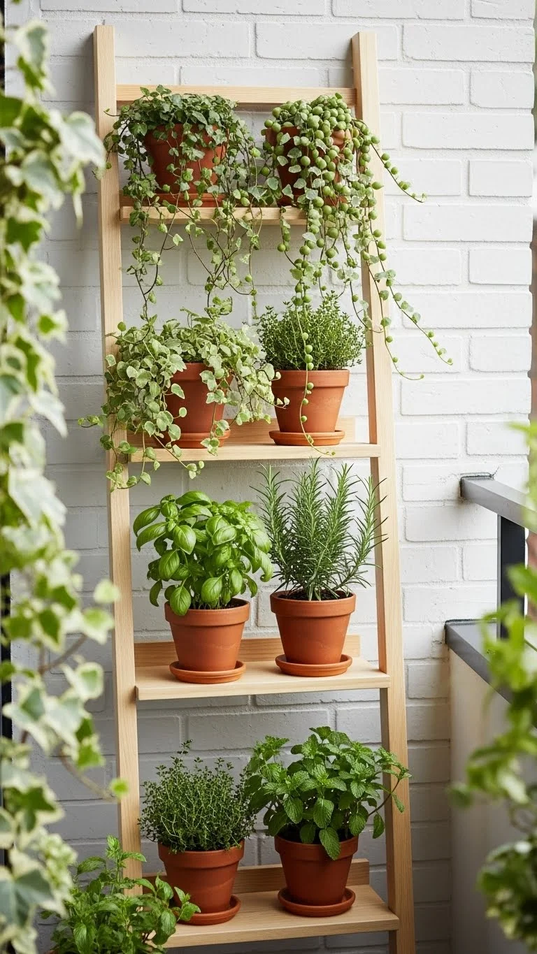 Vertical ladder shelves fit perfectly against a narrow wall. They hold several pots without taking floor space. Start with an inexpensive ladder shelf from a thrift shop or build one using scrap wood. Paint it to match your balcony colors. Add herbs like basil, mint, or thyme to the top shelves where they get the most light. Place heavier pots on the bottom for stability. Keep the setup light and clean. Water trays help avoid mess.