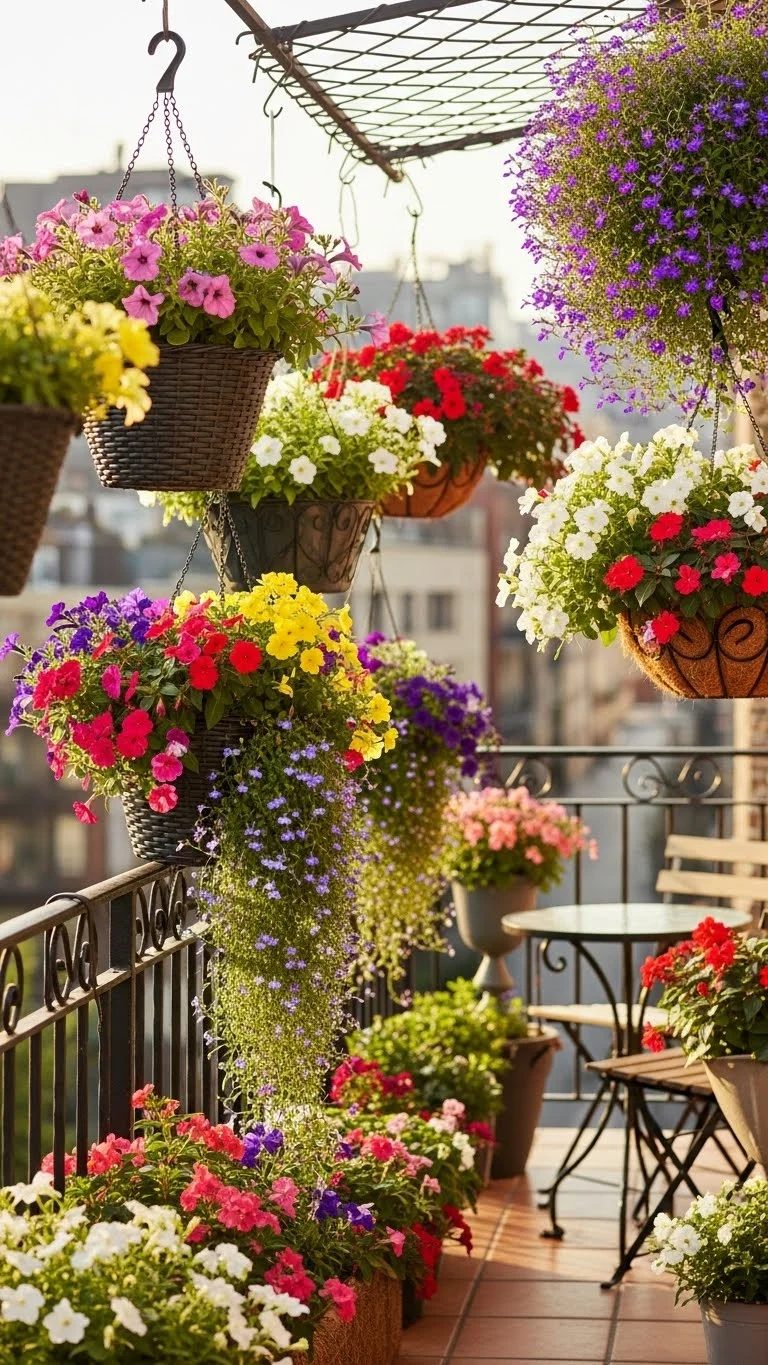 Hanging baskets bring color without taking floor space. Choose hardy flowers like petunias or geraniums. Use lightweight potting mix to keep baskets from sagging. Water slowly so it doesn’t spill over. Mix trailing and upright flowers for variety. Place baskets where they won’t block walking paths. This setup brightens your balcony instantly.
