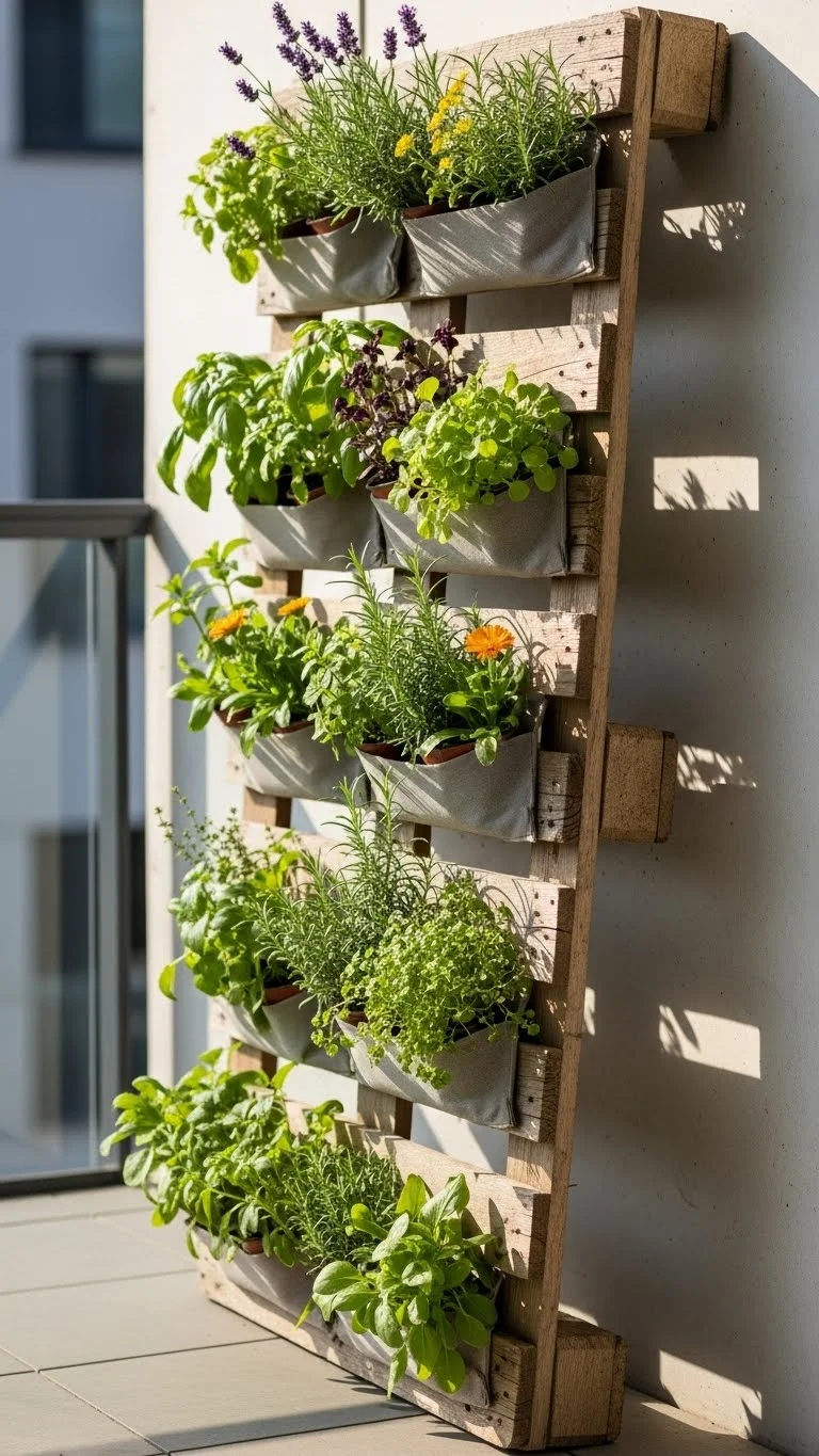 Pallets can turn into tall planters with simple tools. Clean the wood and sand rough edges. Add landscape fabric behind each opening to hold soil. Plant herbs or flowers in rows. Lean the pallet against a wall or secure it upright. This idea saves money and space. It also creates a rustic look that fits most balcony styles.