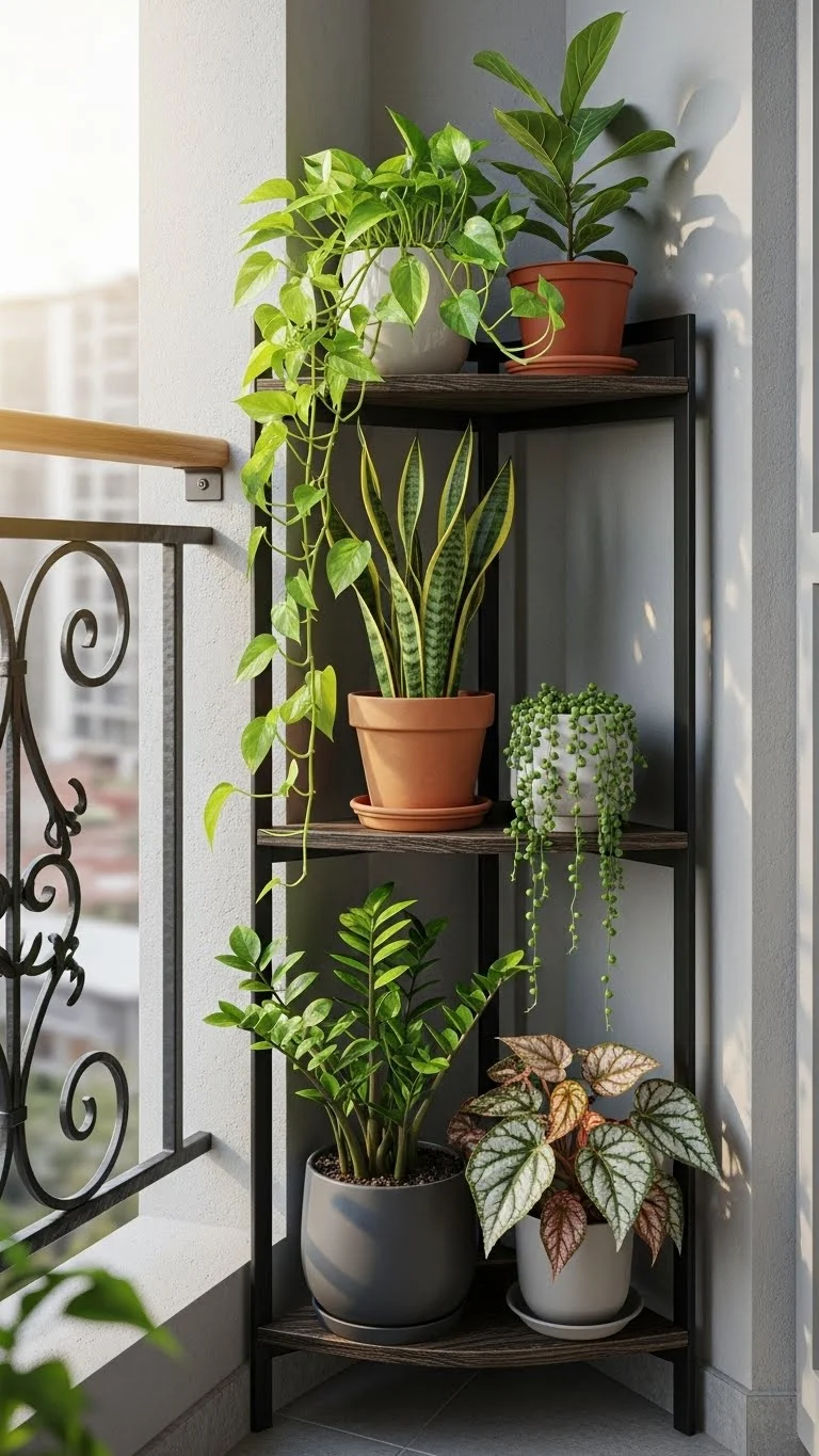 Corners often go unused. A slim corner shelf gives you several levels for pots. Use it for smaller plants like mint, aloe, or pansies. Choose a style that resists moisture. This setup keeps the balcony tidy and organized. Move plants around each season to match sunlight patterns. Corner shelves keep everything accessible without clutter.