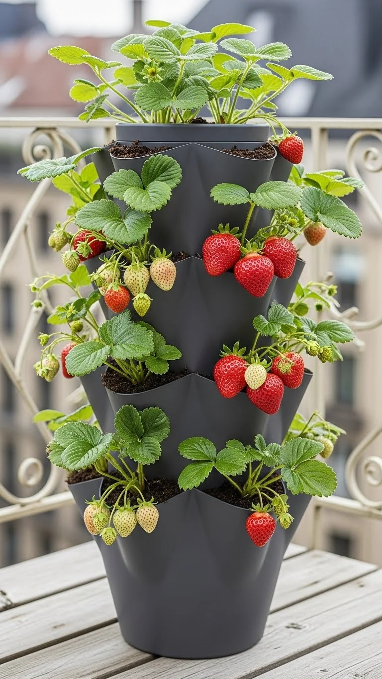 Tower pots offer space for many strawberry plants in one vertical stack. Place the pot in a sunny spot and water from the top so it trickles down. Add compost for steady growth. Strawberries love warm balconies. They produce small fruits even in compact setups. This is a fun project for beginners and families.