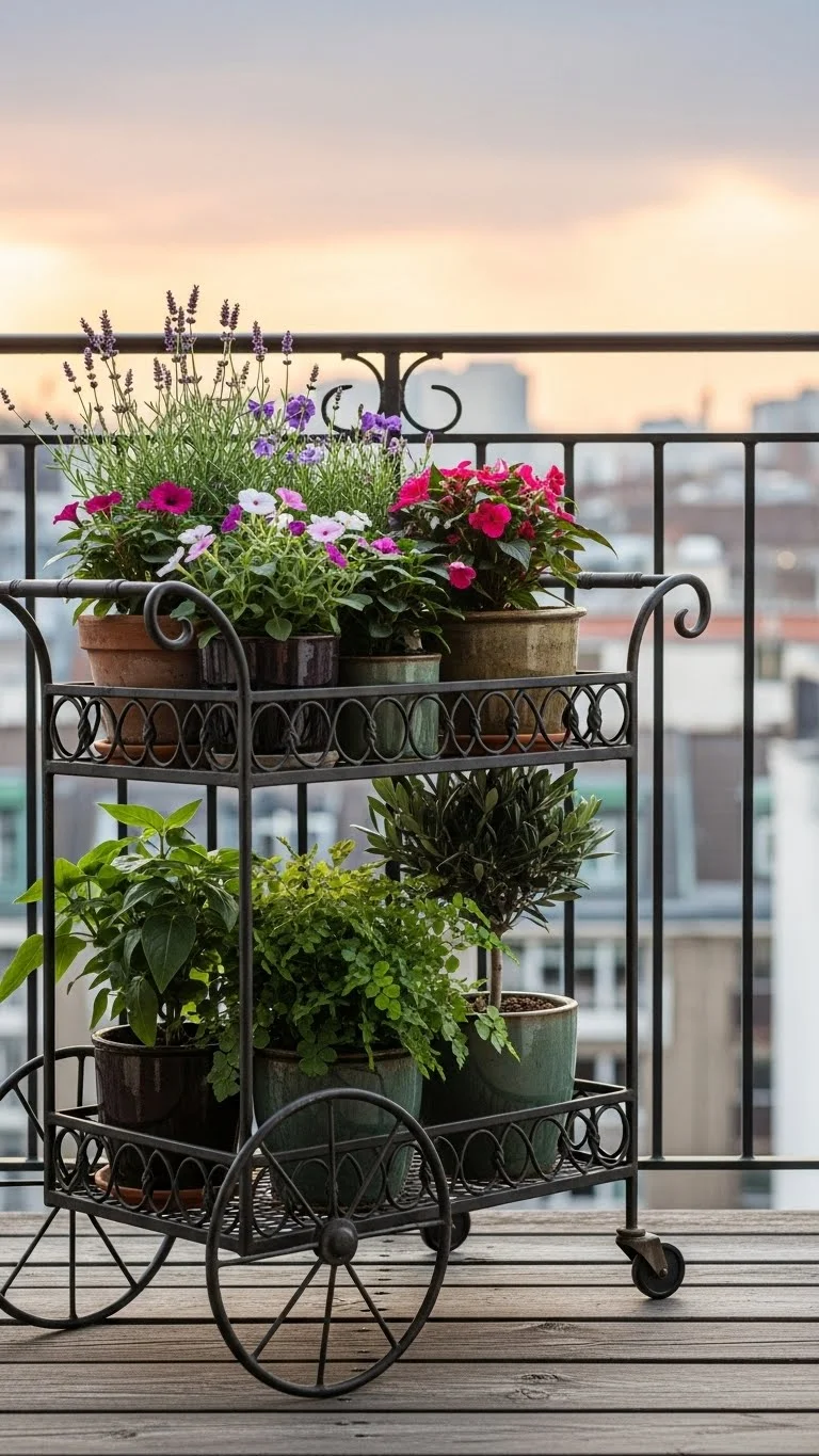 A small rolling cart lets you move plants around when sunlight shifts. Choose a cart with two or three tiers. Use the top shelf for sun lovers and lower shelves for shade plants. Roll it aside when you need extra space. Carts work well for renters since nothing is permanent. Keep it under cover on rainy days to protect metal parts.