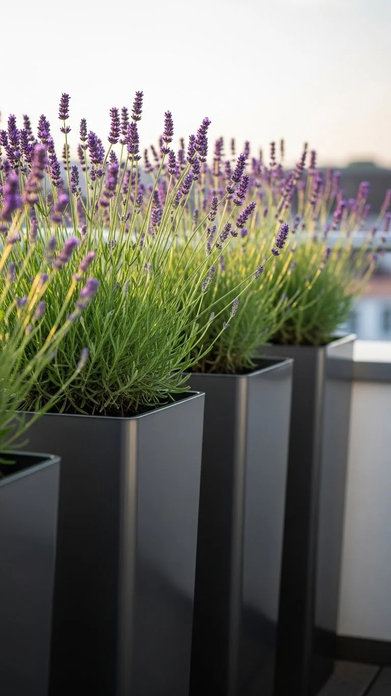 Lavender adds scent and color. Choose narrow pots to save space. Keep them in the sunniest area available. Lavender prefers dry soil, so water lightly. Trim the tips when they get too long. Pots with a matte finish give the setup a calm look. This plant handles heat well, making it great for sunny balconies.