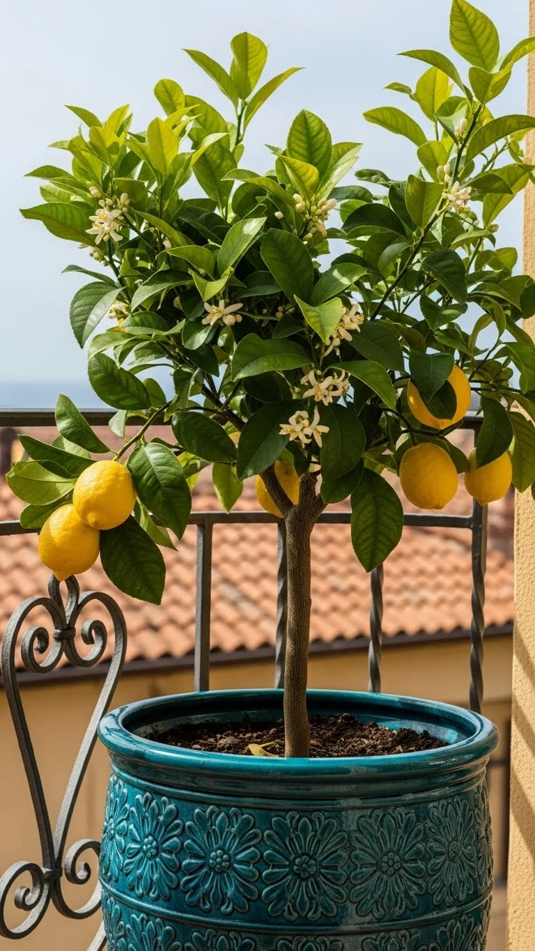 Dwarf citrus trees grow well in medium pots and stay compact. Place them in a bright spot. They add fragrance and color through the year. Use lightweight soil and a pot with wheels if you want easy moving. Water when the top soil dries. Small citrus varieties are perfect for balconies with warm weather.
