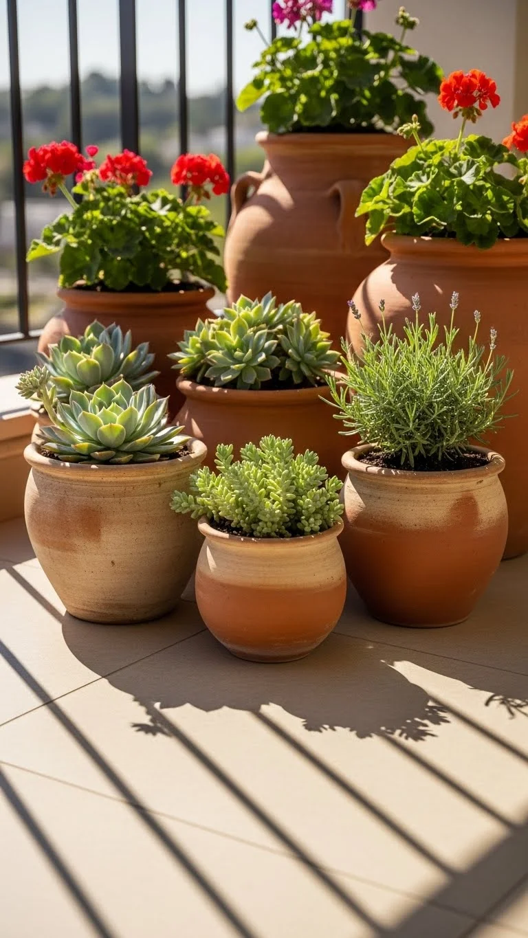 Clay pots stay cool and drain well. They work nicely for heat-loving plants like rosemary or small peppers. Arrange them in a row along the sunniest edge. Clay is affordable and lasts for years. Add a saucer to protect the balcony floor. Rotate pots monthly to keep plant growth even.