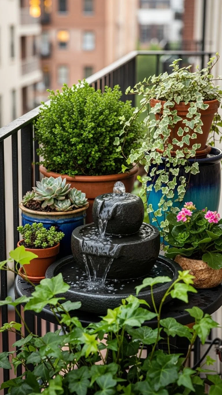 A tabletop fountain adds soft sound and pairs well with greenery. Place it in a shaded corner and surround it with plants that handle low light. Even a small fountain makes the balcony feel calm. Keep wires tucked away. Choose a solar fountain if you want to avoid outlets. Add ferns or peace lilies nearby for a cool, lush look.