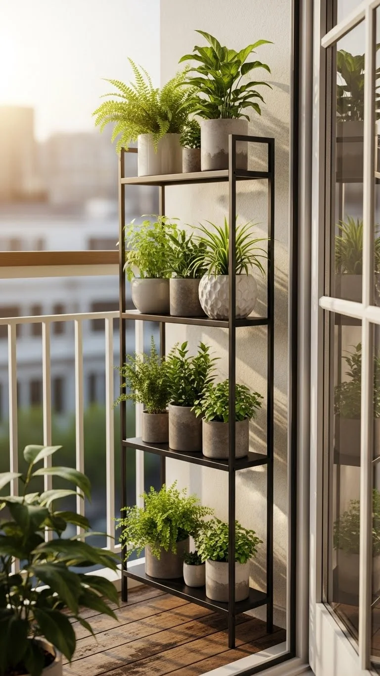 Metal shelves are sturdy and handle weather well. They offer several levels for pots, giving you more greenery in less space. Pick a narrow shelf if your balcony is extra tight. Place sun-loving plants on top and shade-loving ones lower. Metal wipes clean fast, which helps in dusty areas. Add small felt pads under the shelf to avoid scratching balcony floors.