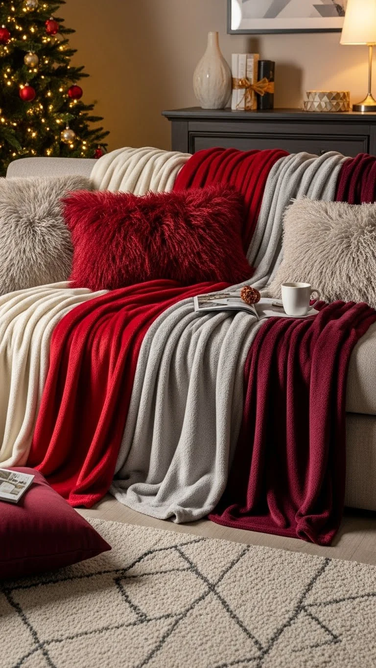 Swap everyday pillows for softer, warmer ones. Use faux fur, chunky knit, or flannel covers. Mix patterns like snowflakes, plaids, and simple solids. If you don’t want to buy new pillows, just buy covers—more affordable and easy to store. Add two large pillows on each side of the sofa and a smaller one in the center. This creates comfort without taking up too much space.
