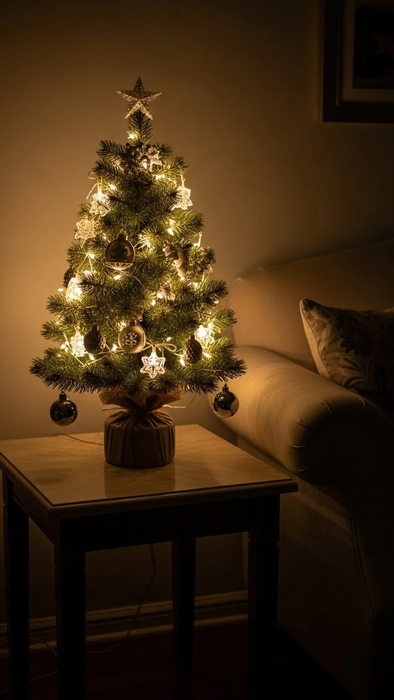 A small tree adds charm without taking much space. Place it on a side table or shelf. Add tiny ornaments, dried oranges, or small bows. Use a mason jar or basket as a base. This idea works well for small living rooms or apartments. It adds a soft glow and fills empty corners easily.