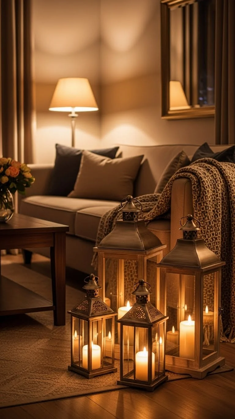 Lanterns create warm light pockets. Place two or three near the fireplace or beside the sofa. Use LED candles for safety. Mix wood and metal lanterns for texture. You can also add a bit of greenery inside the lanterns for a holiday touch. They’re reusable year-round, making them a smart purchase.