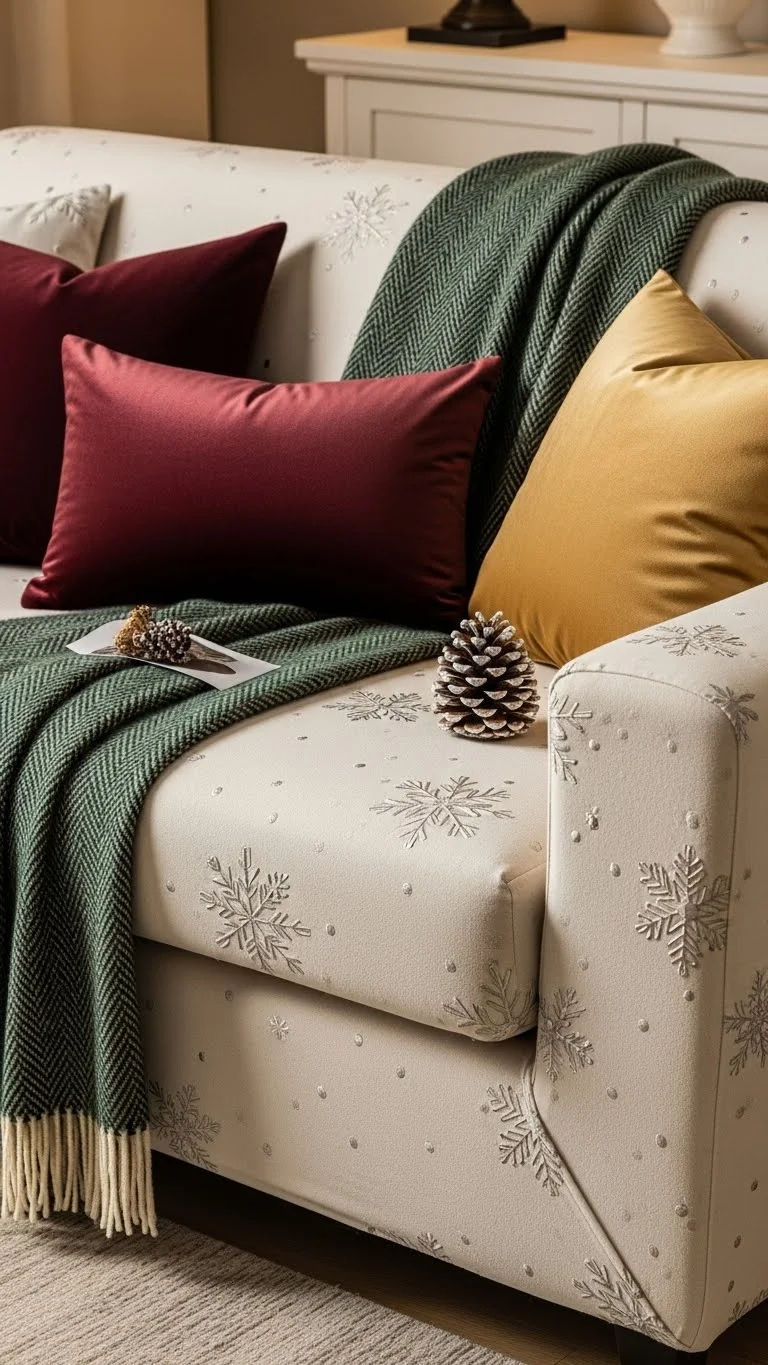 Cover pillows or small chairs with seasonal fabric. You can use low-cost slipcovers or simply drape fabric over the top. Choose soft prints like red stripes or winter patterns. This saves money because you don’t need new furniture or décor. Store the fabric easily after the holidays.