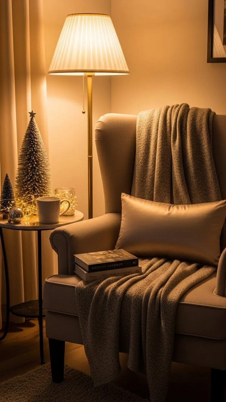 Turn a corner into a holiday reading nook. Add a soft chair, a blanket, and a pillow. Place a small tree or candle nearby. You can set a basket of books beside the chair. This creates a space where you can relax during the season. It doesn’t require much—just rearrange items you already own.