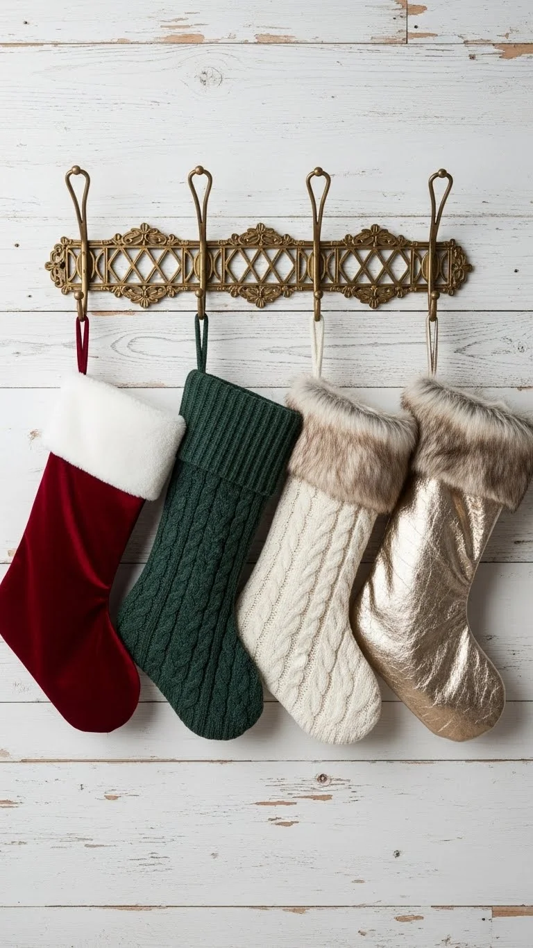 If you don’t have a fireplace, hang stockings on a wall rack. Use simple hooks or a wooden board with pegs. Add greenery above the rack for color. This keeps the stockings organized and adds a holiday touch to plain walls. It’s a great option for apartments or small spaces.