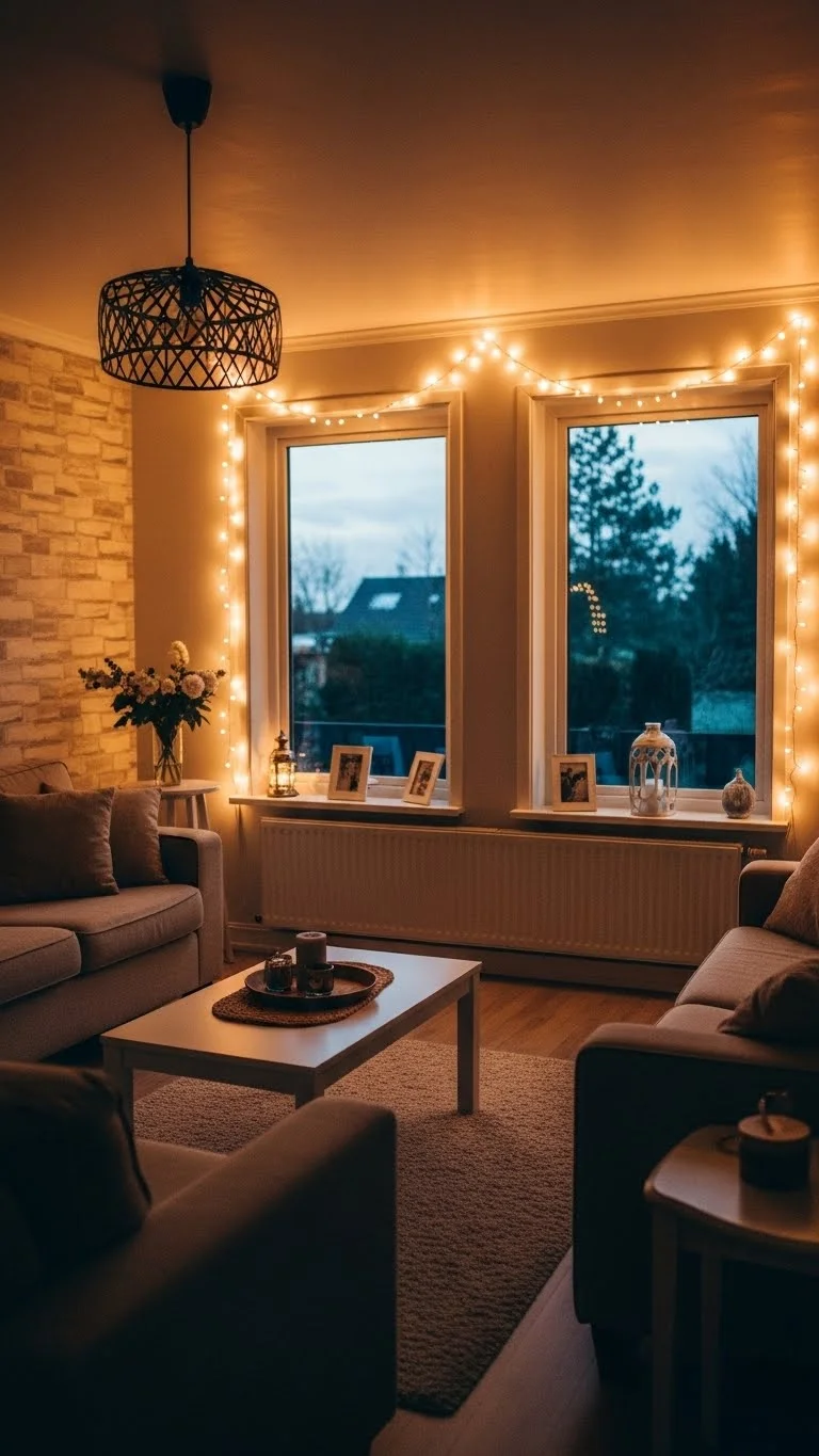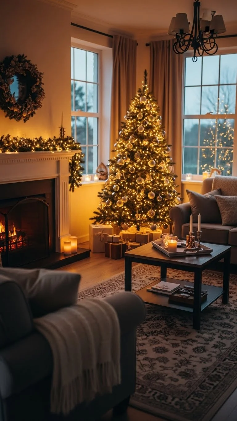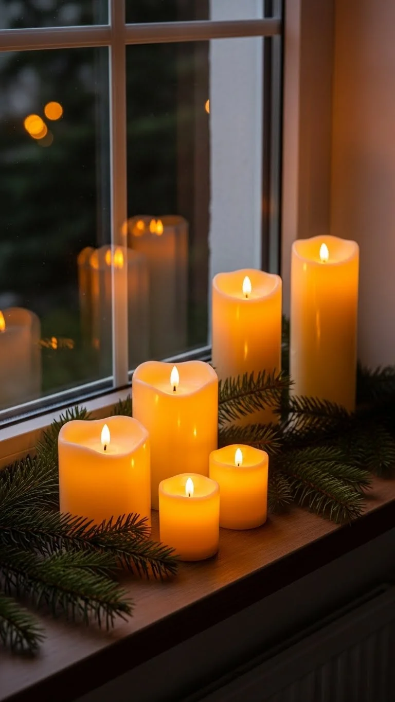 Place flameless candles along your window ledge. Add pine sprigs or small ornaments between them. The glow looks lovely from both inside and outside. This is a great option if your living room feels dark. Use battery candles to keep it safe and simple.