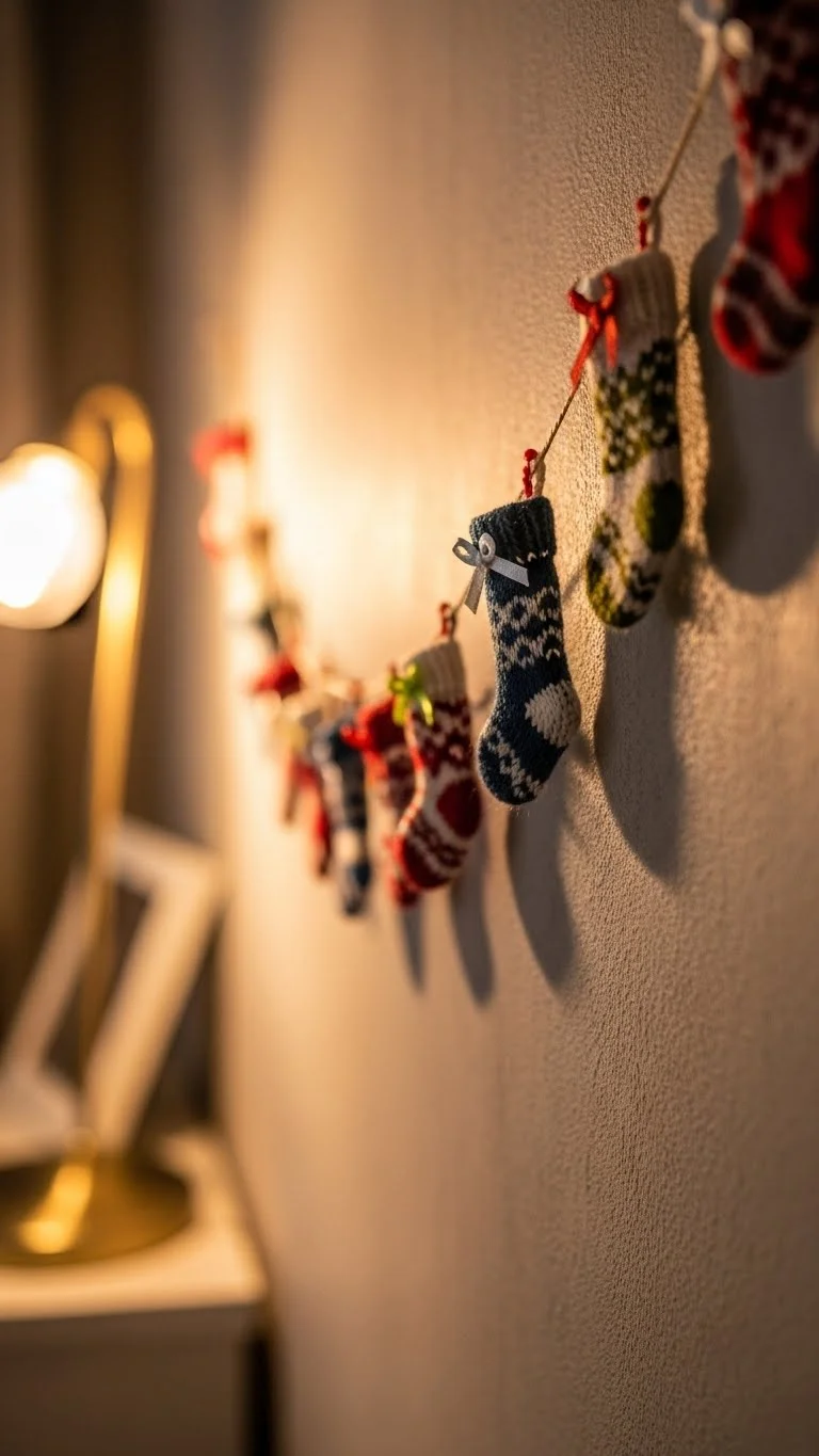 Make or buy tiny knit stockings. String them together with twine and hang them across a wall or shelf. Fill some with candy or mini pine sprigs. This adds charm without overwhelming your living room. It’s easy to store and lasts for years.