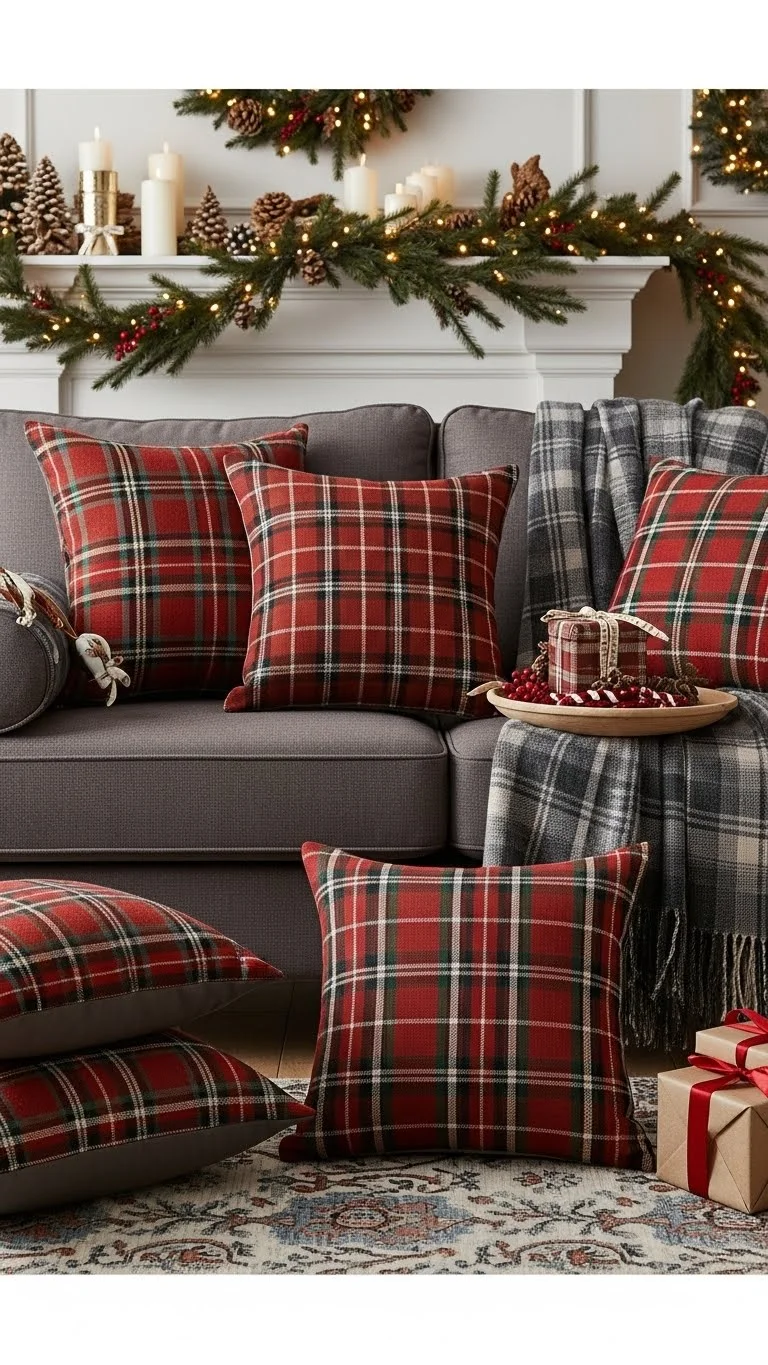 Plaid patterns instantly feel warm. Add plaid pillows, blankets, or ribbon. Stick to one color palette so the room doesn’t feel busy. Look for leftover fabric pieces and craft simple pillow covers yourself. This adds a cozy winter feel without spending much.