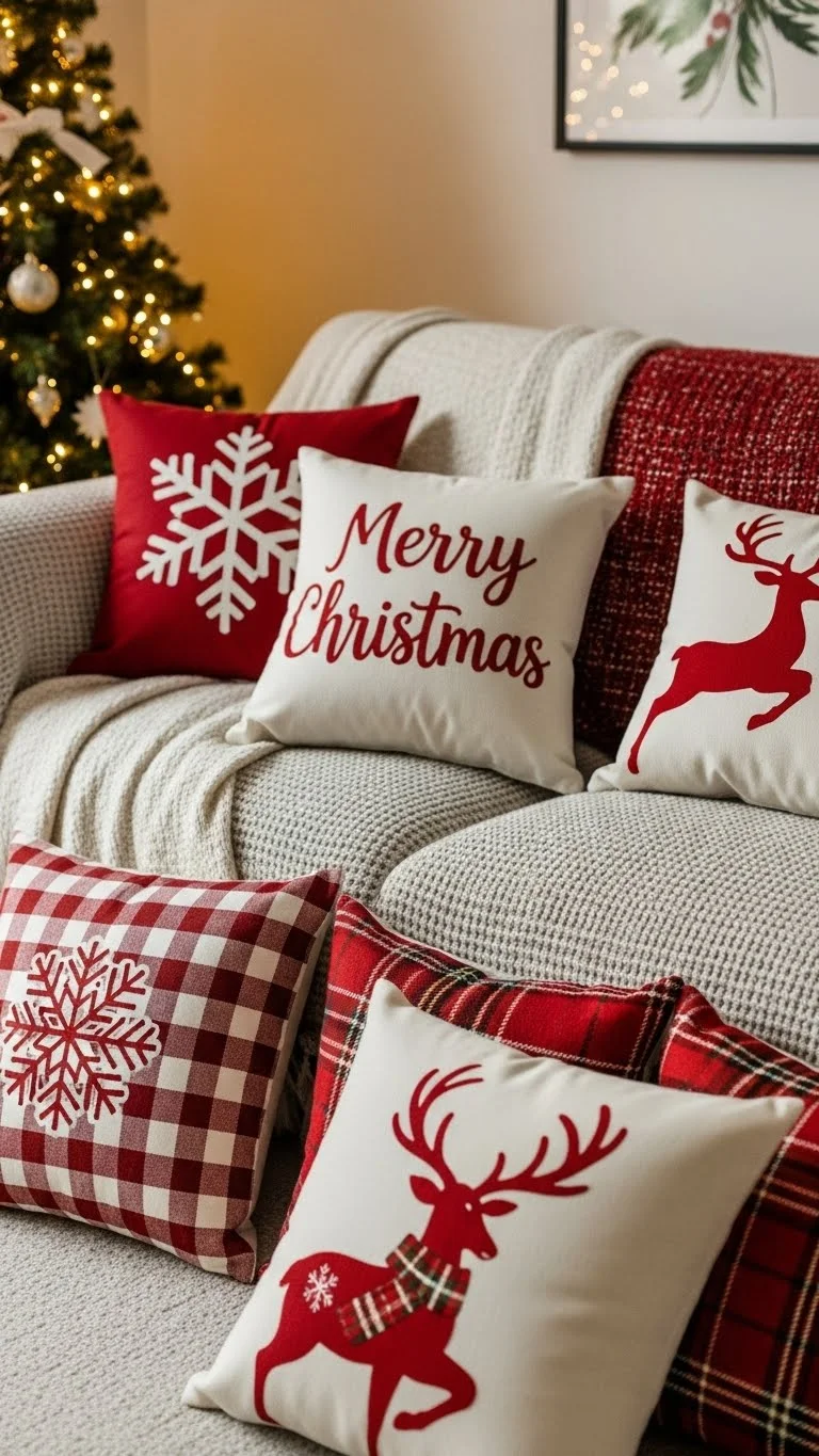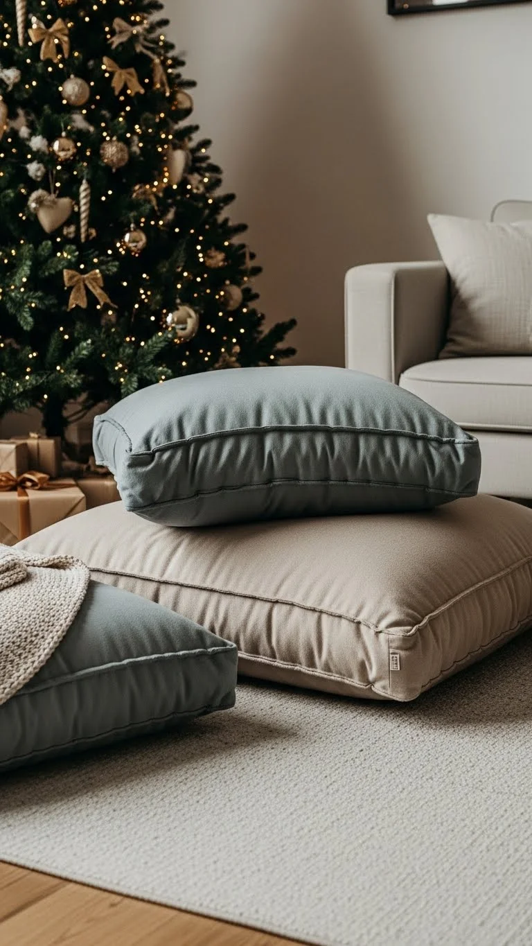 Add oversized floor pillows for lounging. Choose soft fabrics like velvet or knit. Place them near the Christmas tree or coffee table. This gives guests extra seating and makes the room feel relaxed. You can reuse summer floor cushions by covering them with seasonal fabric.