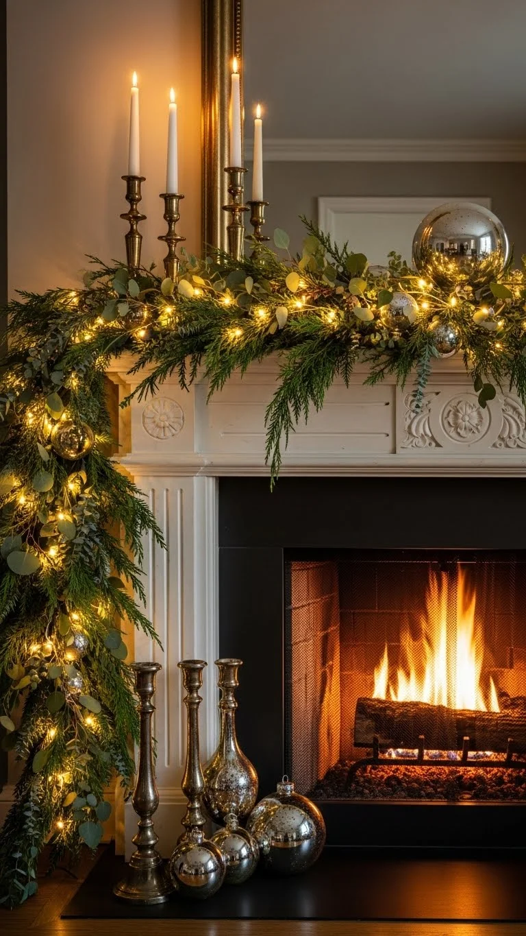 A garland instantly shapes the room. Use faux greenery if you want something long-lasting. Drape it across the mantle and tuck warm lights inside. Add pinecones or berries for color. If you want a fuller look, place small ornaments between branches. You can even make your own garland using inexpensive greenery from craft stores. The mantle becomes a relaxing focal point that feels calm and festive.
