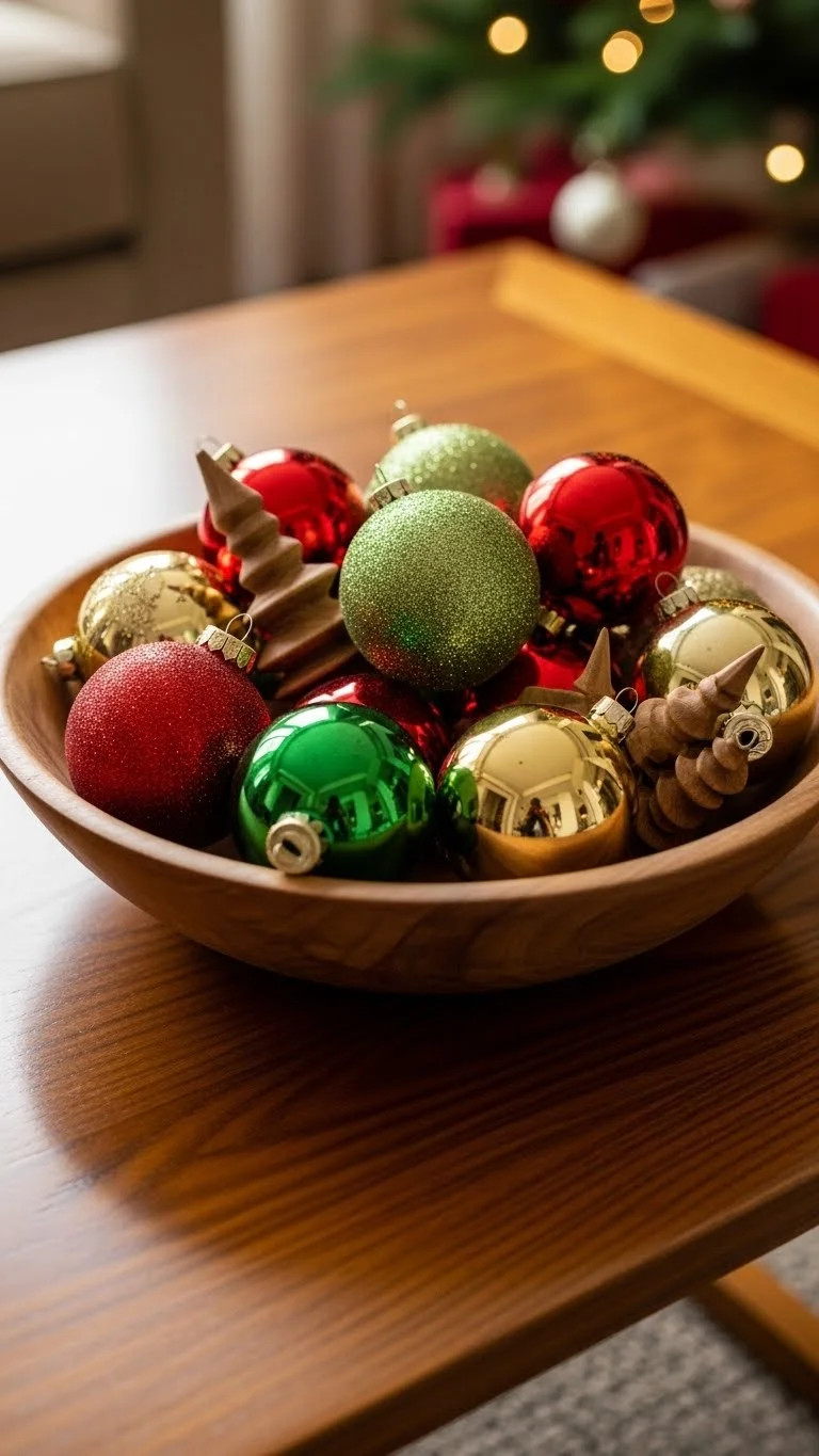 Fill a bowl with ornaments for a quick décor touch. Use leftover ornaments or mismatch sets you already have. Place the bowl on your coffee table, side table, or shelf. Mix matte, shiny, and textured finishes for interest. If you want warmth, add a few pine sprigs inside the bowl. This takes less than a minute and costs nothing if you use what you own.