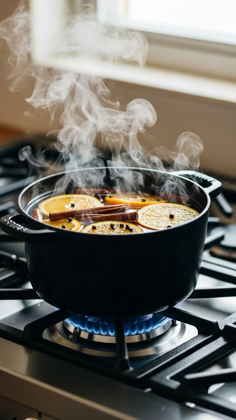 A simmer pot makes your living room feel cozy through scent. Add orange slices, cinnamon sticks, and cloves to a small pot of water. Let it simmer on low heat. The scent spreads through your home and feels warm without being strong. It’s inexpensive and can be reused by adding more water. Keep the pot on the lowest setting and check it often.