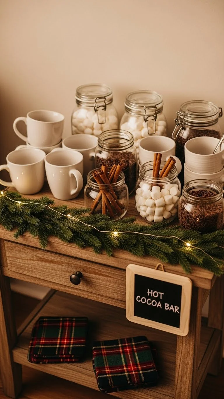 Set up a small cocoa station in the living room. Use a tray, two mugs, and small jars for marshmallows or cocoa mix. Add a simple holiday sign or a tiny wreath. You don’t need many items—just a few pieces arranged neatly. This creates a cozy mood for movie nights and makes guests feel welcome.