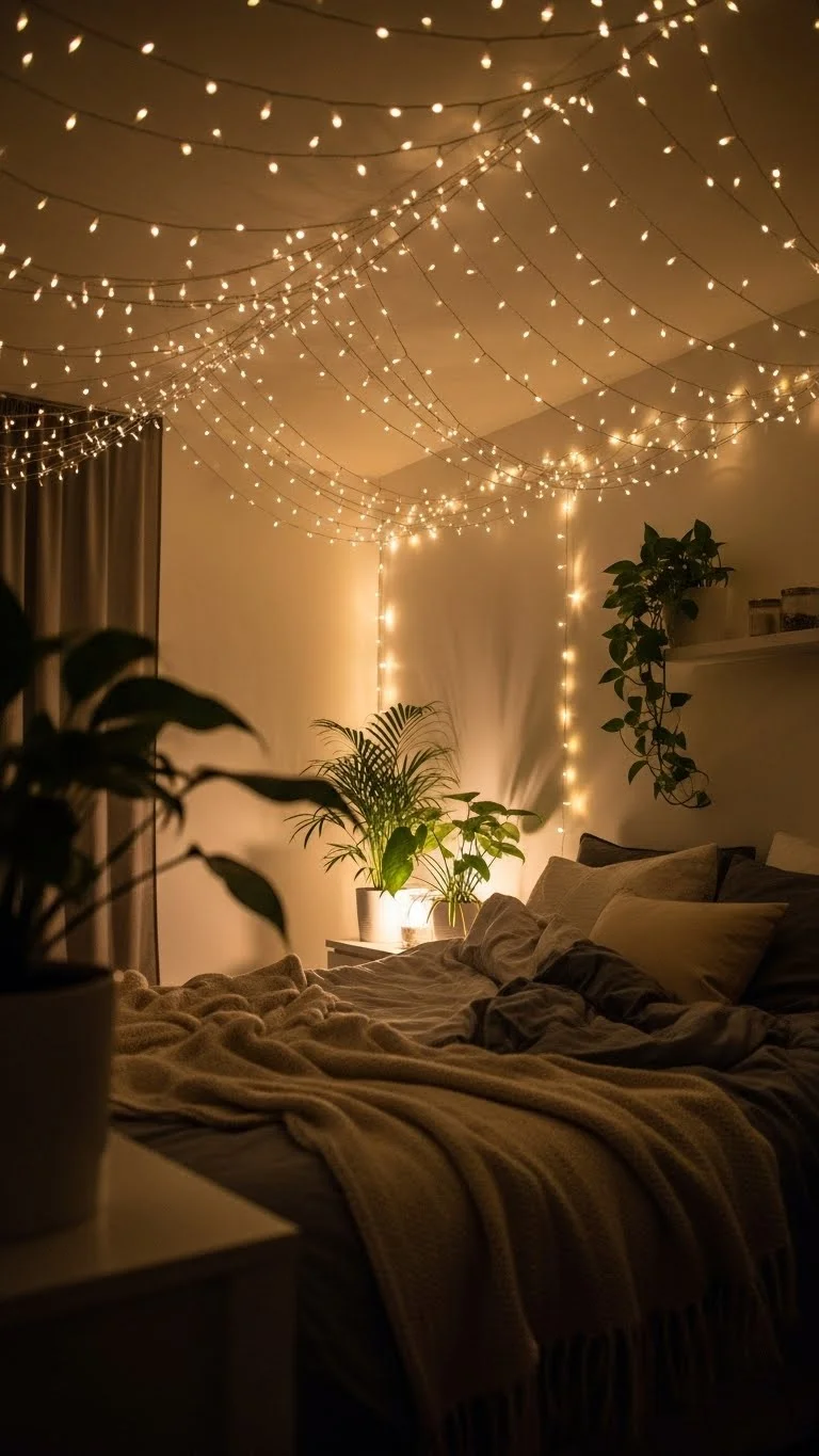 Soft string lights instantly create a gentle glow and cozy vibe. Drape them loosely across the ceiling or along walls to create a soft, ambient light. You can even mix fairy lights with small decorative paper stars for an added festive touch. Removable hooks make setup easy, especially for renters, and layering shorter strands instead of one long one helps achieve a fuller, more charming effect. Add some pine sprigs nearby for a subtle seasonal accent.