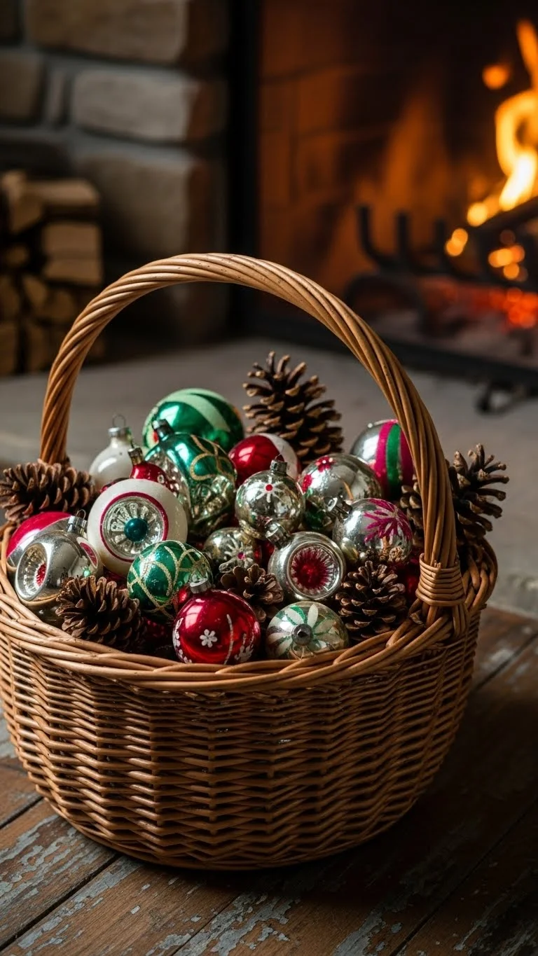 Baskets filled with ornaments offer a simple, flexible decoration. Use woven or wooden baskets, fill them with a mix of ornaments and pinecones, and optionally add fairy lights. This low-effort setup works on floors, tables, or shelves. Inexpensive plastic ornaments look great alongside more decorative pieces, giving a full, cozy appearance.