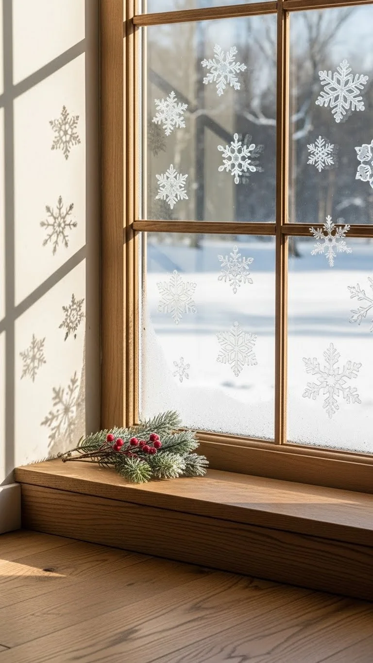 Snowflake clings create winter charm quickly. They stick and peel off easily without residue. Arrange varying sizes across windows or mirrors for variety. For DIY fun, cut snowflakes from paper. Complement with string lights for a soft glow, making windows festive and eye-catching.