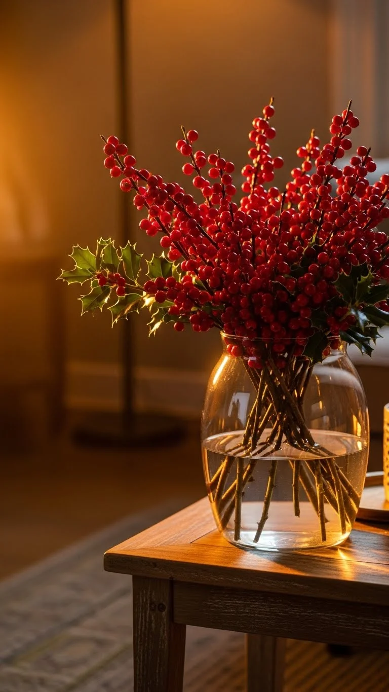 Red berry stems provide a pop of color and can be used in small or large vases. They pair beautifully with pine or eucalyptus branches. Faux berries are long-lasting, while real ones give a natural look. Even a single sprig in a tiny vase brightens a corner.