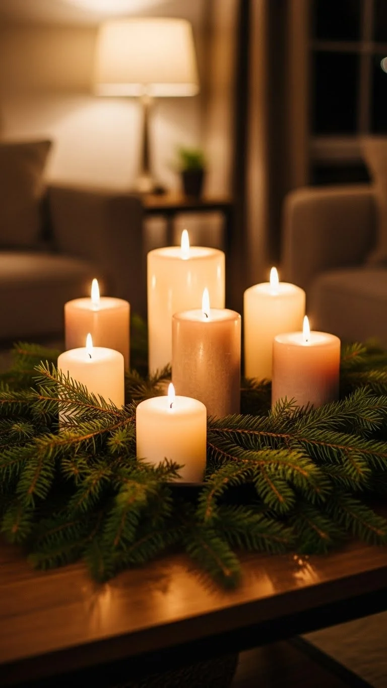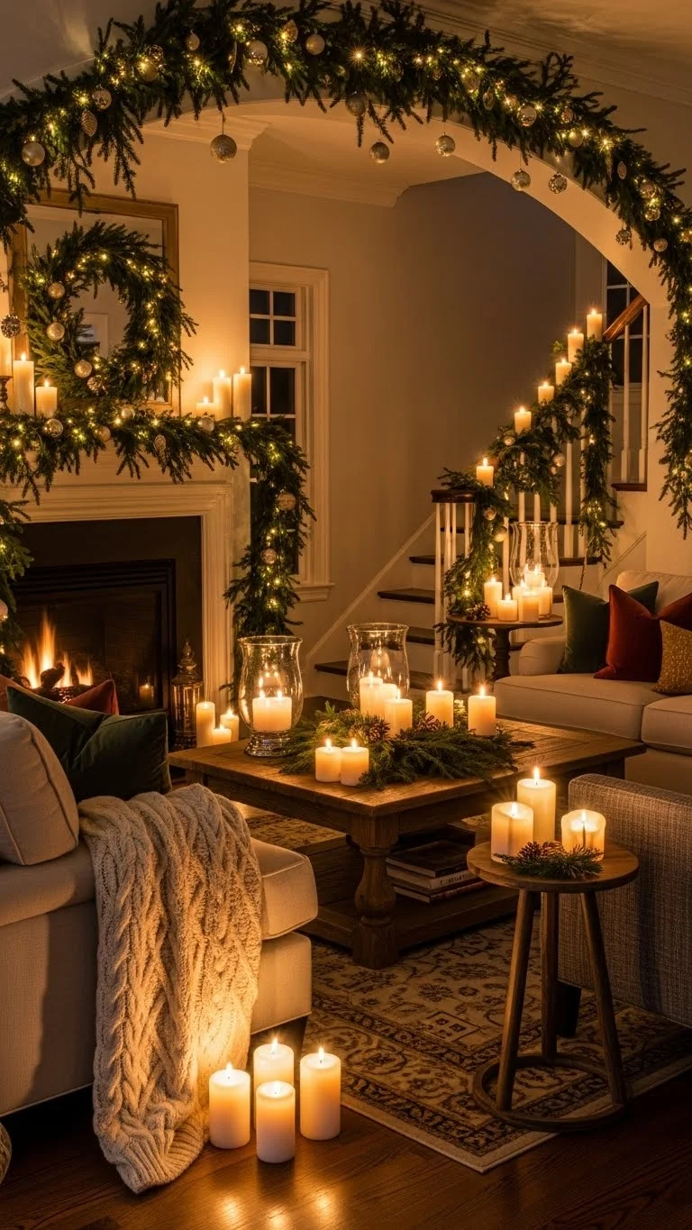 Candles provide warmth and a gentle glow that instantly makes rooms feel cozy. Grouping candles of varying heights adds visual interest, and surrounding them with pine, ribbon, or small ornaments enhances the holiday ambiance. LED candles are safe alternatives, offering the same effect without a flame. Fragrant options like pine, vanilla, or cinnamon create a multisensory seasonal experience.