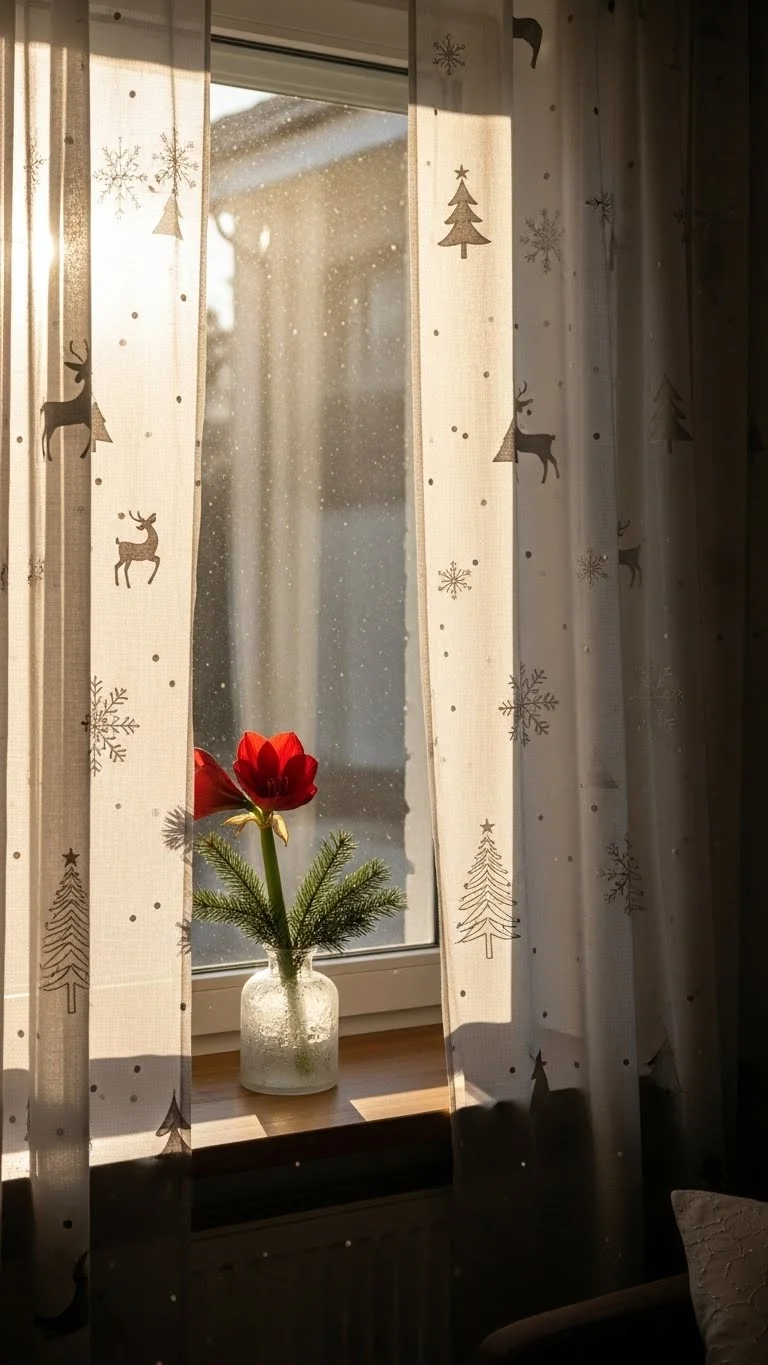 Curtains provide warmth and subtle seasonal charm. Hang patterned curtains or clip small ornaments to existing ones. Ribbon tiebacks add extra flair. A simple change like this shifts the atmosphere of a bedroom, living room, or dining space without requiring additional decorations.
