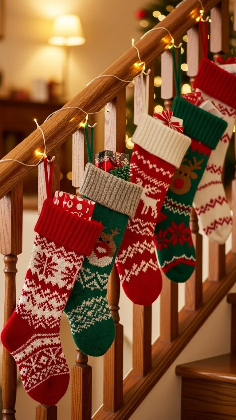 Stockings can appear beyond the fireplace. Hang them along stair rails, bed frames, or bookshelves to create playful touches. Small adhesive hooks make placement simple and damage-free. For a DIY approach, old sweaters can be repurposed into stockings with basic sewing or fabric glue. Sprigs of greenery tucked inside add natural charm.