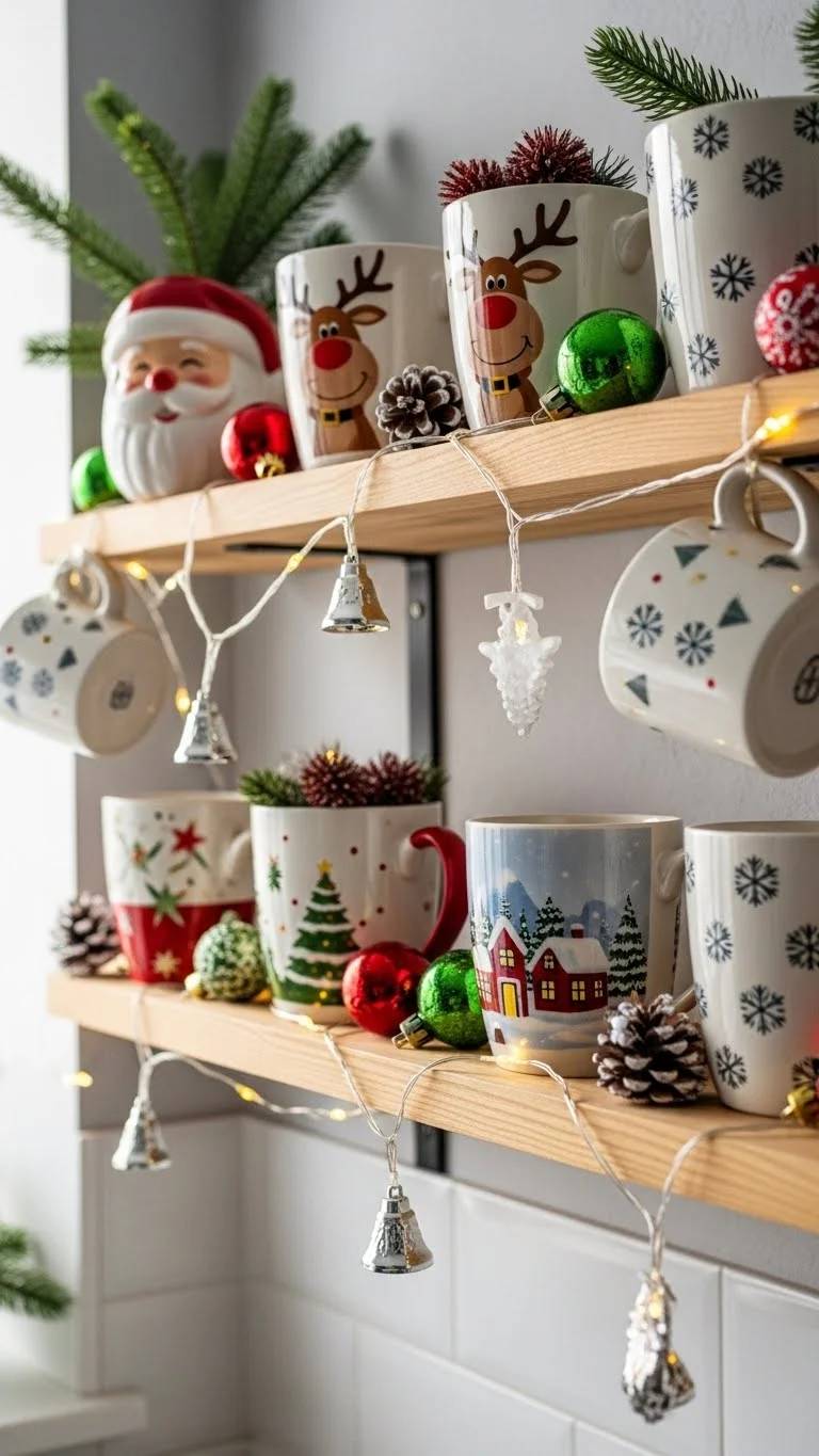 Displaying mugs adds seasonal charm to kitchens and dining areas. Arrange them on shelves or a small tray near coffee or tea stations. Even a single festive mug can enhance the holiday feel. For DIY flair, tie ribbon around handles or add small greenery nearby. This inexpensive decoration doubles as a functional piece for holiday beverages.
