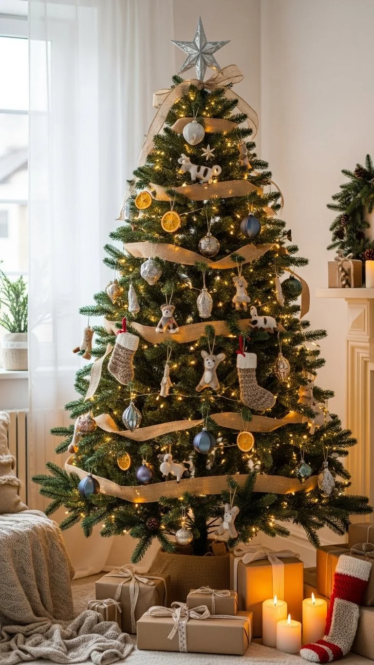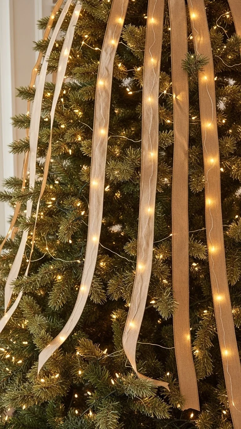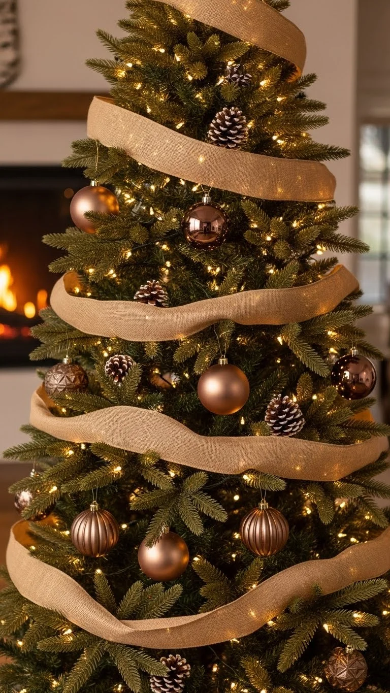 Jute ribbon gives your tree a simple, rustic feel. Wrap it loosely in wide spirals around the tree. Don’t pull it tight; give it a soft wave. Jute is inexpensive and very durable. Pair it with pinecones, wooden ornaments, or dried oranges. If you want more warmth, add warm white string lights. The texture of jute brings a grounded, cozy touch.