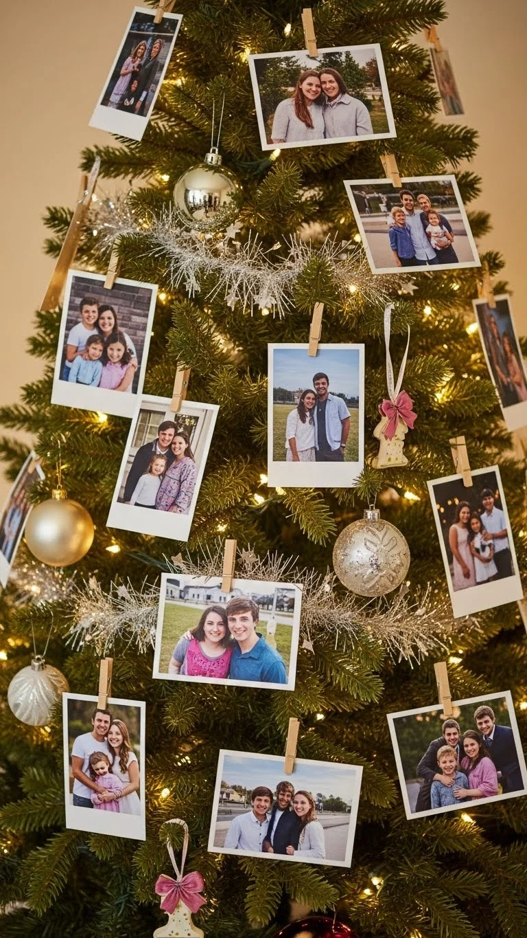 Print small photos from your phone. Use black-and-white prints for a classic feel. Clip them onto branches using mini clothespins. Mix them with simple ornaments so the photos stand out. This turns your tree into a memory wall. It’s meaningful and very cheap. You can swap photos each year or create new sets for different themes. Kids enjoy picking the photos, and guests often stop to look more closely.