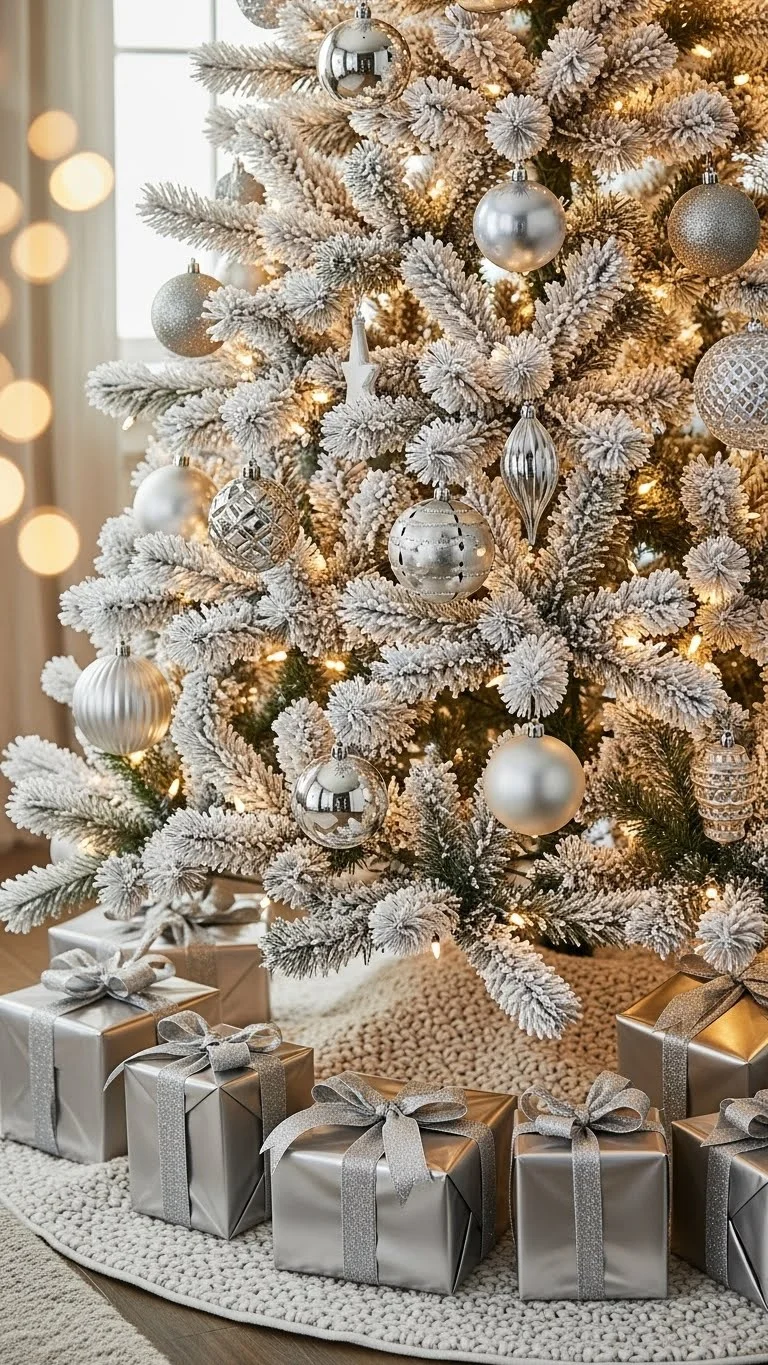 If your tree isn’t flocked, add small touches yourself. Use store-bought flocking spray or a simple mix of white glue and baking soda. Brush it gently on the tips. Let it dry fully. This creates a soft, snowy look without covering the whole tree. It’s cheaper than buying a pre-flocked tree and you can adjust how much you want. Add warm lights to make the flocking glow.