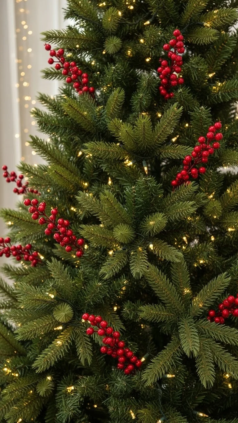 Berry stems give a quick pop of color. Buy a few bunches from a craft store. Cut them into smaller pieces. Tuck them deep into the branches. Spread them evenly across the tree. They pair well with pinecones and simple ornaments. You can reuse these stems for wreaths or table décor. It’s an easy way to add red without using lots of ornaments.