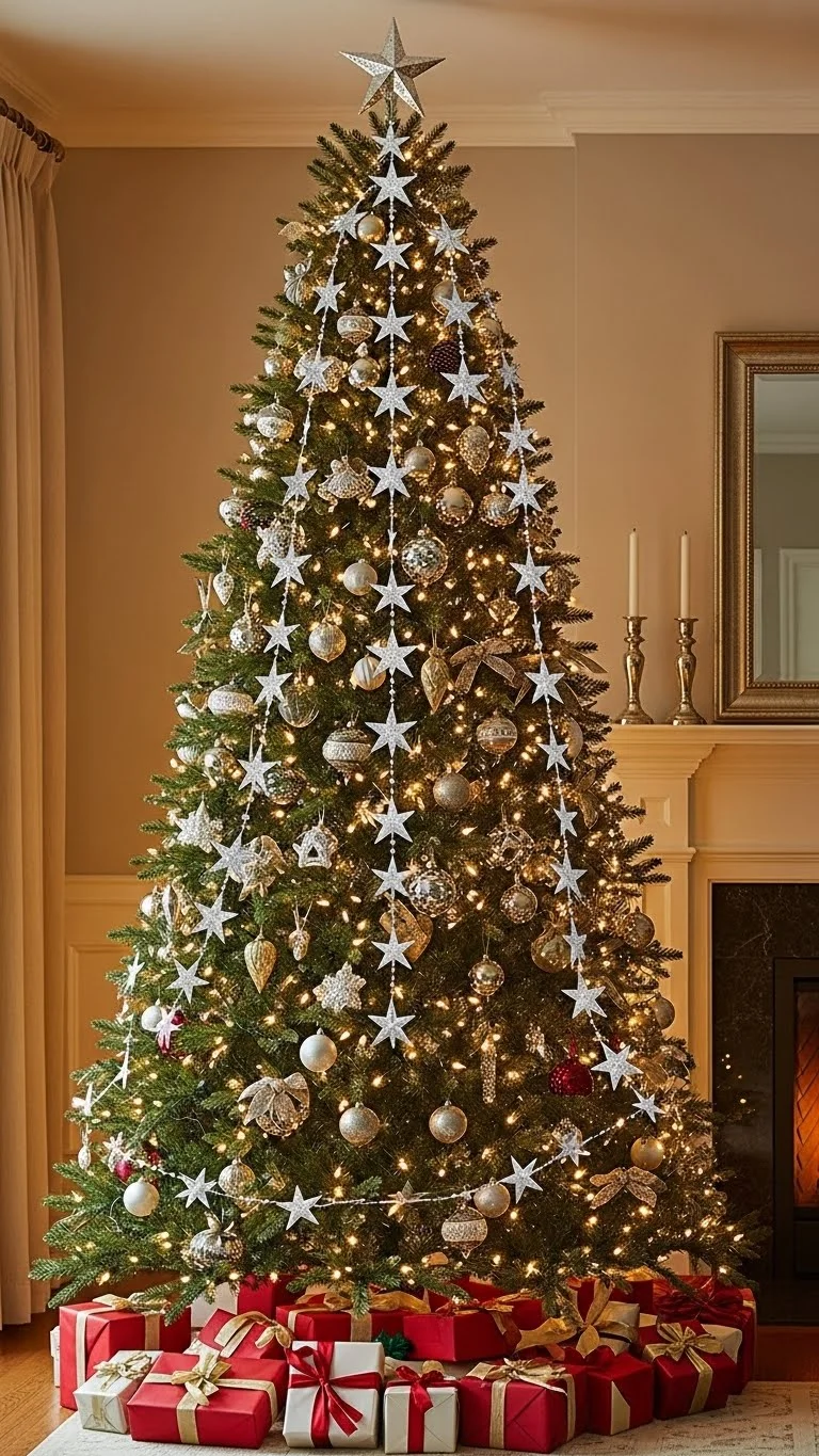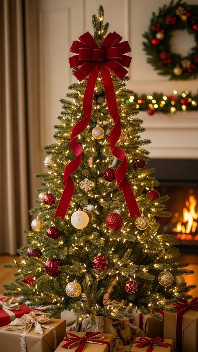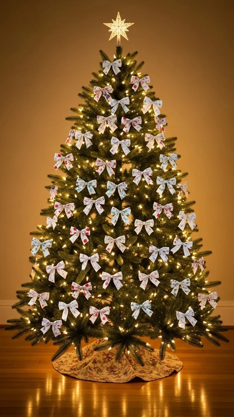 Replace the star with a giant bow. Pick a wide ribbon with wire edges. Tie a full, fluffy bow and secure it at the top. Let long tails fall down the tree. This gives a soft, stylish finish. You can match the bow to other ribbon on the tree. It’s cheaper than buying a new topper and easy to switch each year.