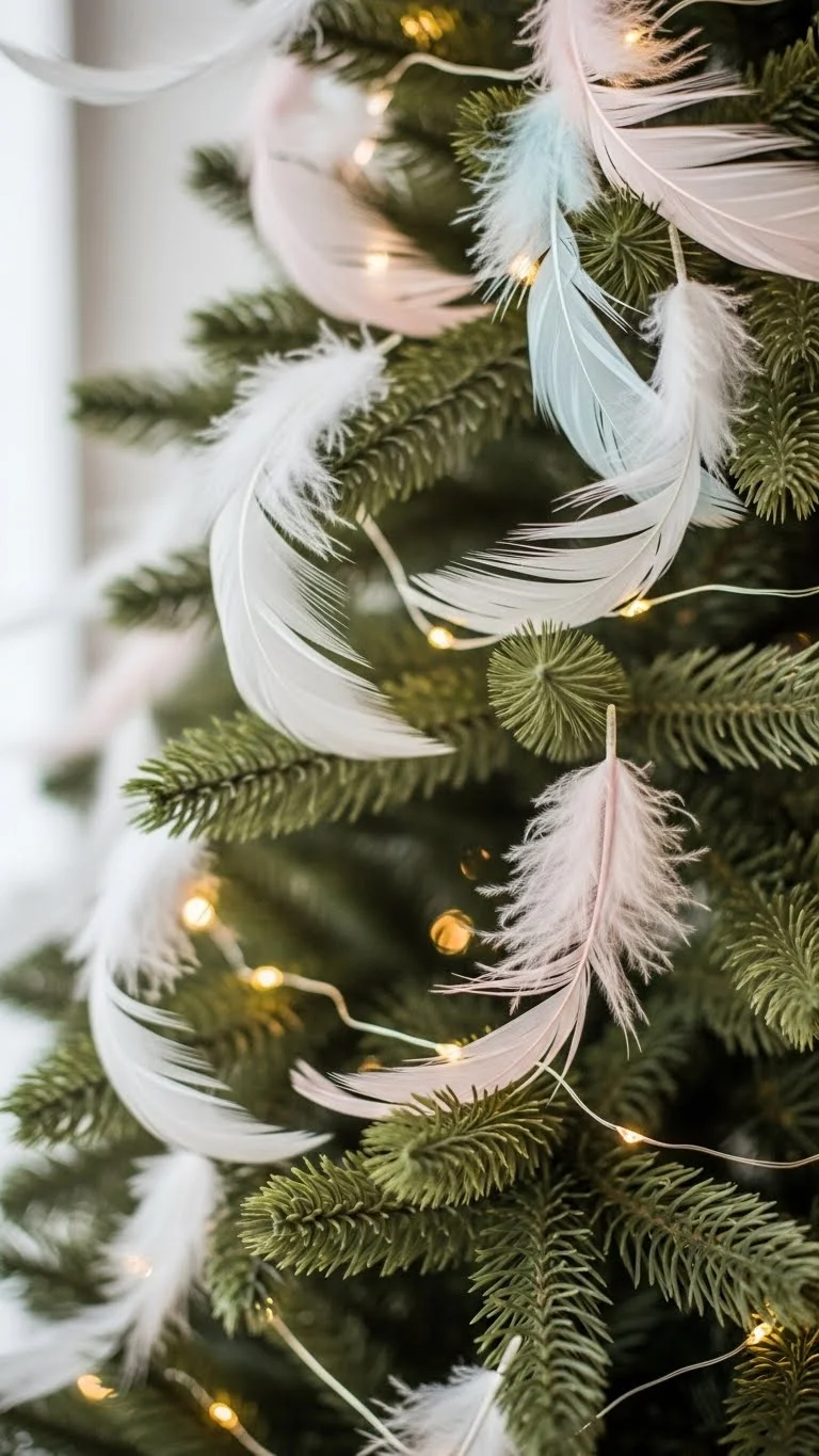 Feathers add softness. Buy a small pack from a craft store or reuse clean feathers from past projects. Tuck them between the branches or attach them to ornament hooks. White feathers create a snow-like effect, while colored feathers make your tree feel dramatic. Use them sparingly so the tree doesn’t look crowded. This idea works well with simple lights and neutral tones.