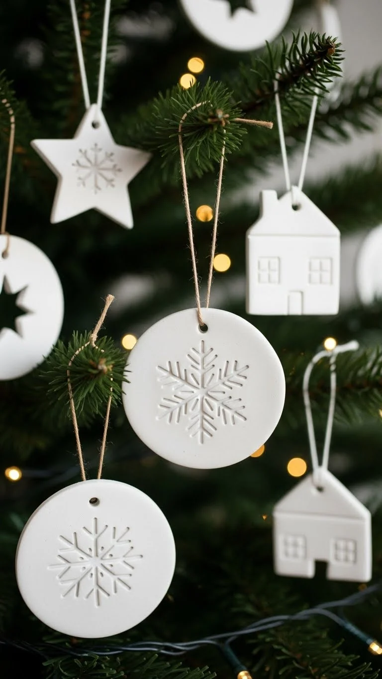 Use air-dry clay to make your own ornaments. Roll out the clay. Press cookie cutters into it. Poke a hole for hanging. Let the pieces dry. Leave them plain or lightly paint the edges. Clay ornaments look clean and modern. They’re also very inexpensive. You can make dozens with one pack of clay. Store them carefully to reuse every year.