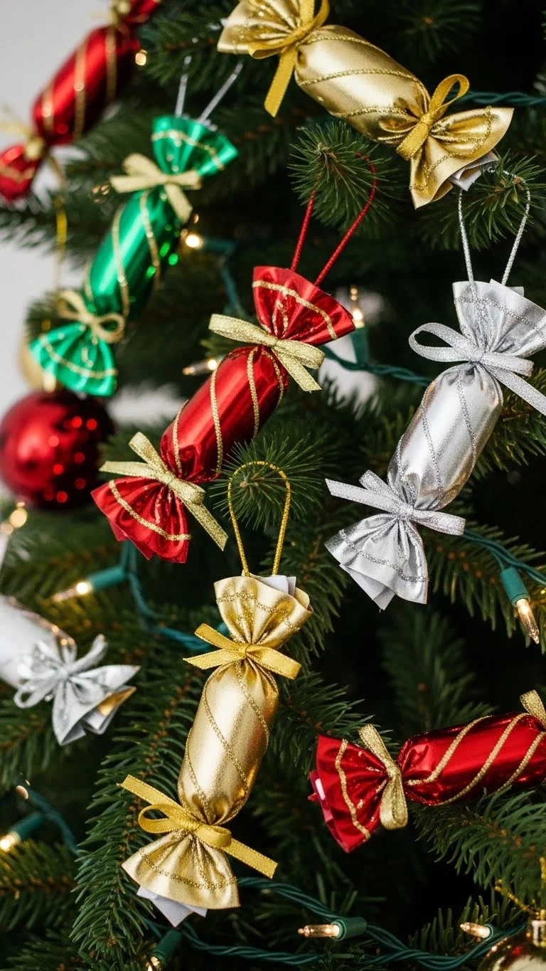 Turn ribbon into candy-shaped décor. Cut short strips. Twist the centers tightly. Pinch each end and tie small knots or use tiny rubber bands. These look like wrapped sweets. Use bright colors for a playful tree. Hang them using ornament hooks. This is a cheap DIY project you can finish fast. It fills empty spots and adds fun color.