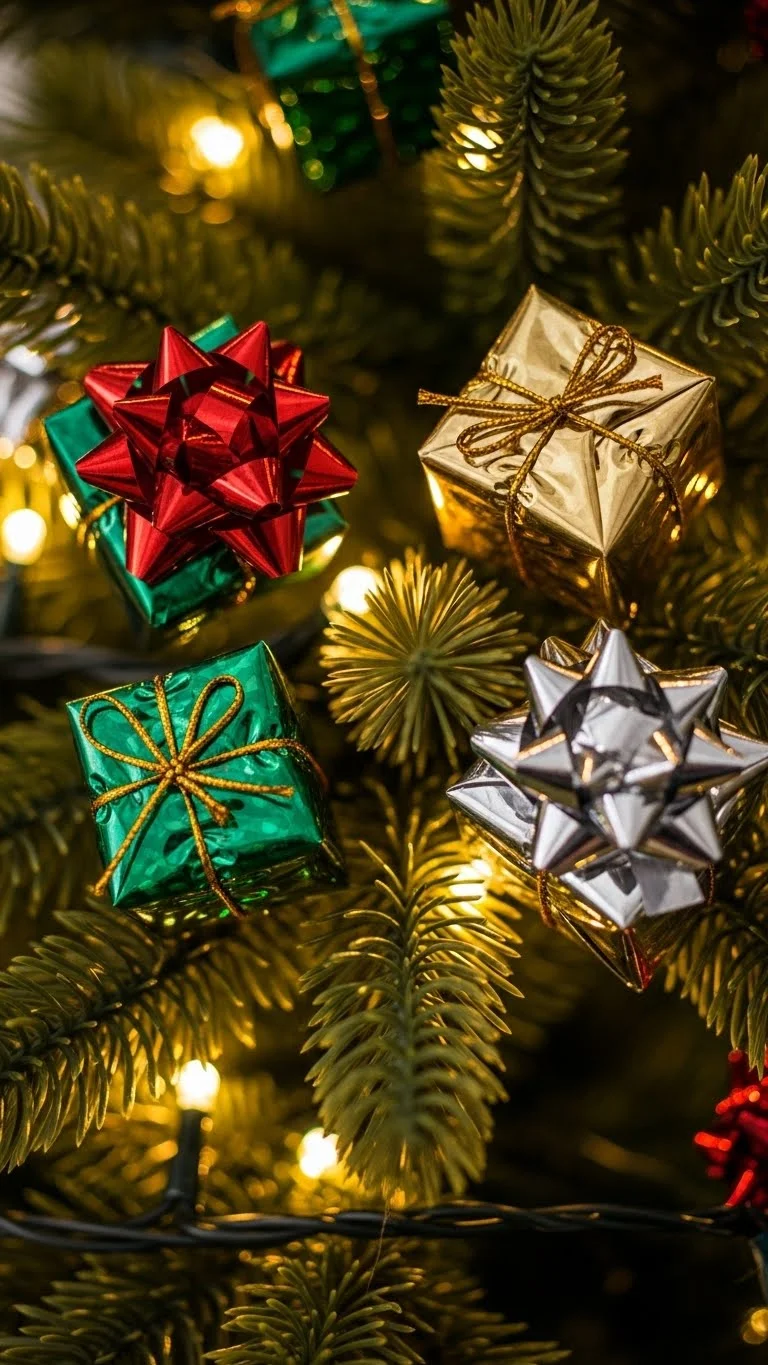 Tiny gift boxes bring a playful touch. Wrap small cardboard squares in scrap paper, spare fabric, or foil. Add twine or a small bow. Hang them with basic ornament hooks or tie them with string. If you want color variety, wrap them in mismatched prints. You can even use leftover jewelry boxes. This is an easy DIY project for kids. Place a mix of shiny and matte “gifts” around the tree for a simple upgrade that costs almost nothing.