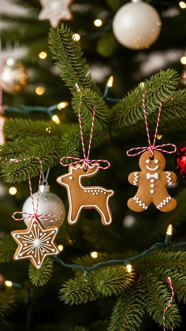 Bake simple gingerbread cookies. Use cookie cutters to shape stars, hearts, or trees. Add a small hole before baking. Let them cool fully. Thread ribbon or twine through the holes. Hang them across your tree. They smell warm and cozy. You can keep the cookies plain or pipe simple white icing designs. They’ll dry hard and last the whole season.
