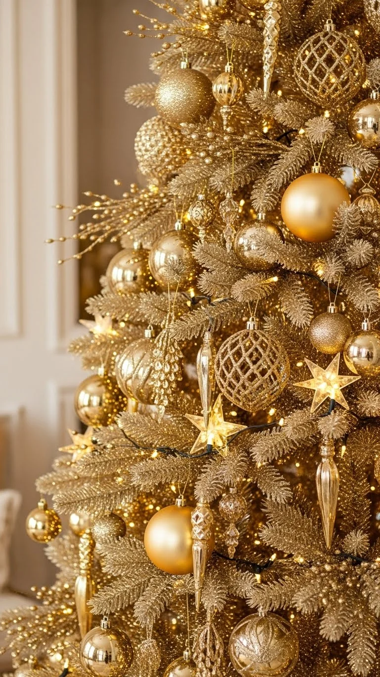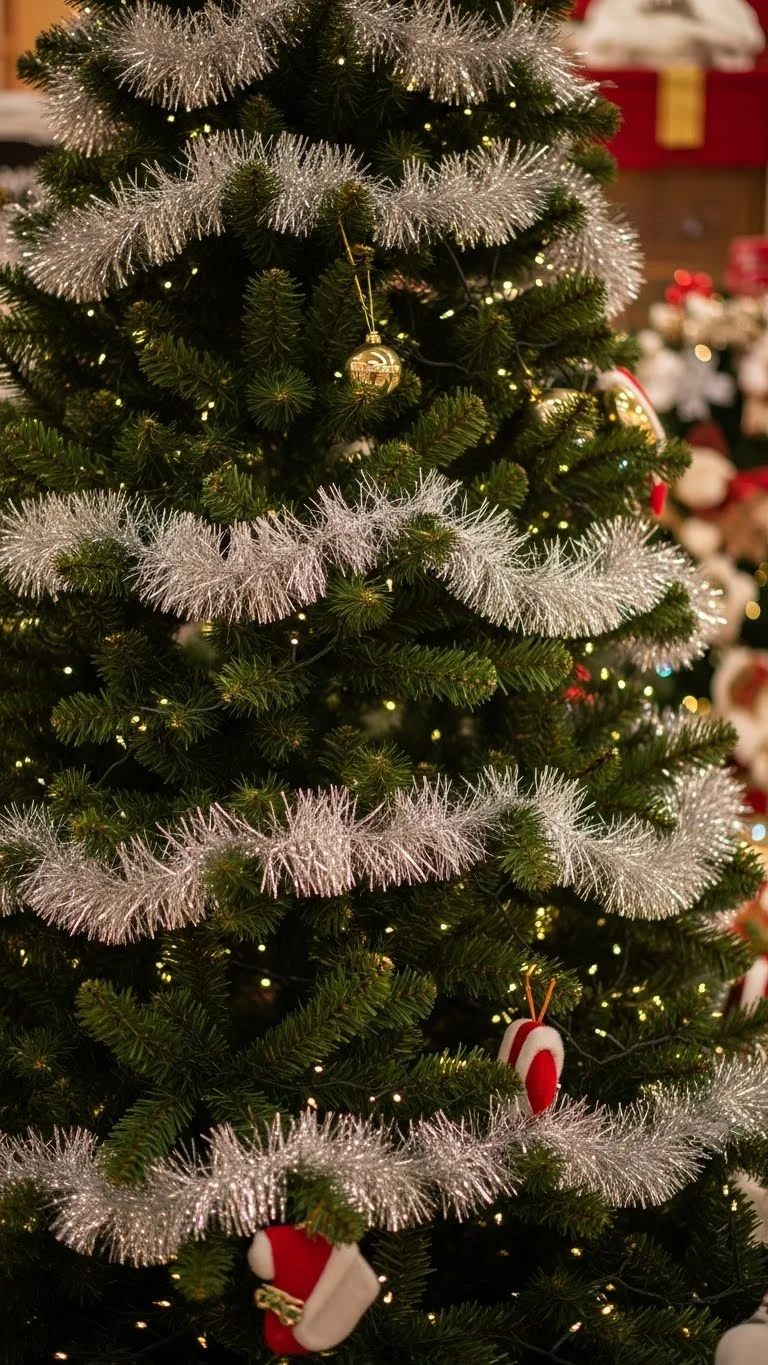 Use tinsel lightly to avoid a messy look. Tear it into small sections. Place the strands deep inside the branches so only the shimmer shows. This adds sparkle without overtaking the tree. Choose gold or silver based on your theme. You can use just a handful to brighten the entire tree. It’s one of the cheapest ways to add shine.