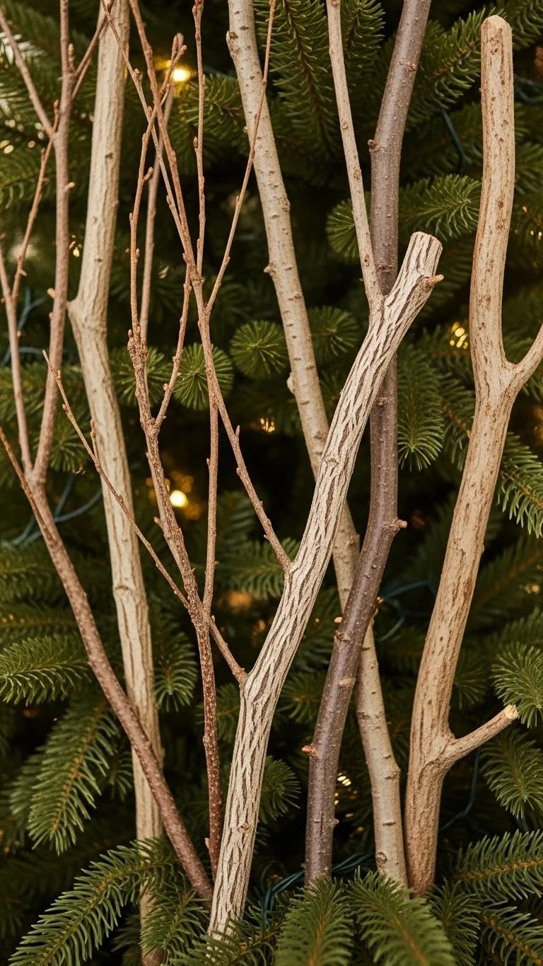 Collect small twigs or branch sprigs. Snip them into six-inch pieces. Tuck them in the outer branches for texture. Spray-paint some gold or white if you want color. This adds shape without buying more ornaments. Use this idea with pinecones, berries, or rustic ribbon. It’s simple, natural, and very low-budget.