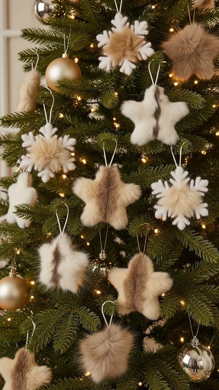 Cut small strips of faux fur from leftover fabric. Make tiny puffs or wrap the fabric around small cardboard squares. Tuck them into the branches for a warm winter look. Mix white or cream fur with neutral ornaments. This idea works especially well in cozy spaces. It adds softness and texture without needing many supplies.