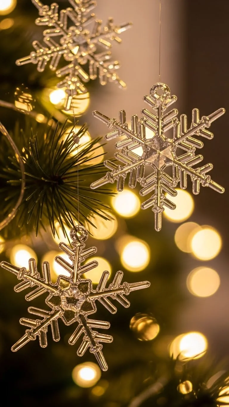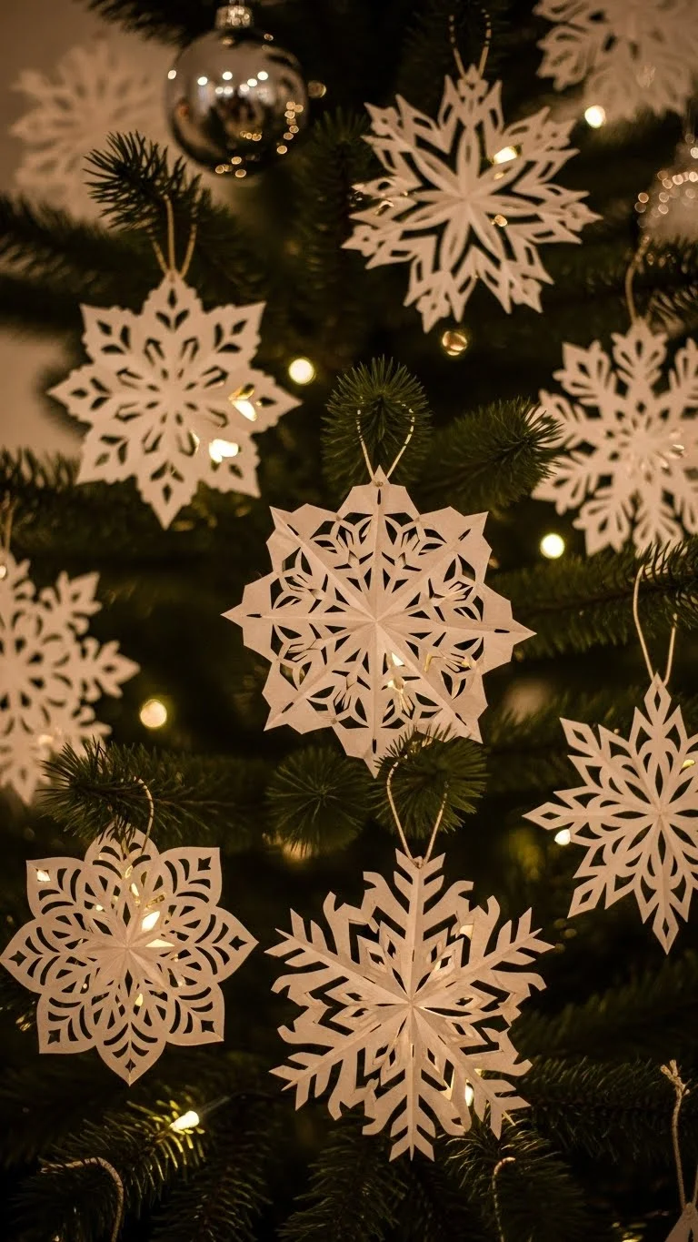 Paper snowflakes cost almost nothing and add a soft winter look. Cut snowflakes from white or pastel paper. Keep some simple and some detailed. Hang them using clear thread. Spread them evenly so they look like a soft snowfall. You can also layer two snowflakes together for more texture. This idea works especially well with a darker tree. It’s quick, budget-friendly, and perfect for a peaceful winter theme.