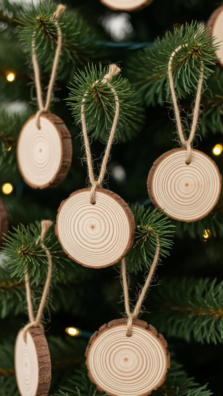 Wood slices give your tree a natural look. Buy a small pack of pre-cut slices or make your own if you have leftover branches. Drill a tiny hole at the top and tie twine through it. Leave the wood plain or draw small shapes using a marker. Keep the designs simple for a clean look. Spread the ornaments across the tree. This gives your décor a warm, natural style without spending much.