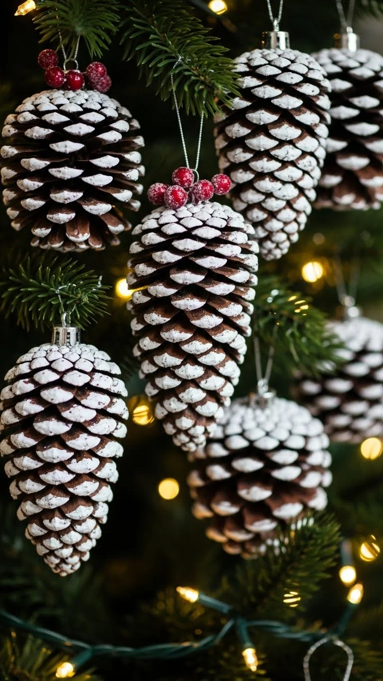 Pinecones add texture and shape. Collect a handful from outside or buy a small bag from a craft shop. Brush the tips with white paint for a snowy look. Let them dry fully. Tie them with twine or ribbon and hang them deep into the branches. Mix smaller and larger cones for more interest. This idea works well with warm lights and simple ornaments. It’s low-cost and very easy to make.