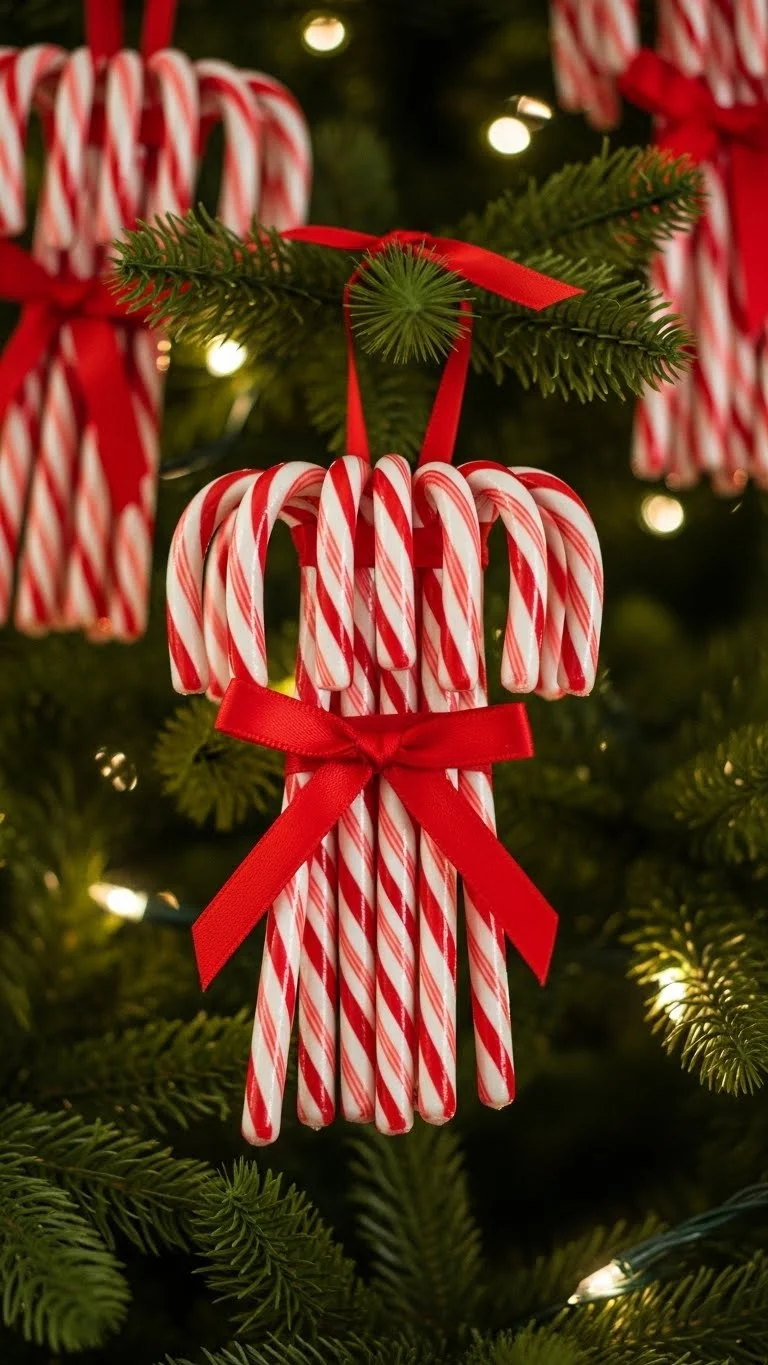 Candy canes add color without effort. Instead of hanging them one by one, group them in clusters of three. Tie them with thin ribbon. Hang the clusters from stronger branches. This adds shape and color throughout the tree. Buy candy canes in bulk to save money. You can also mix classic red-and-white with fun colors like green or gold. Kids enjoy helping with this idea, and it looks cheerful and bright.